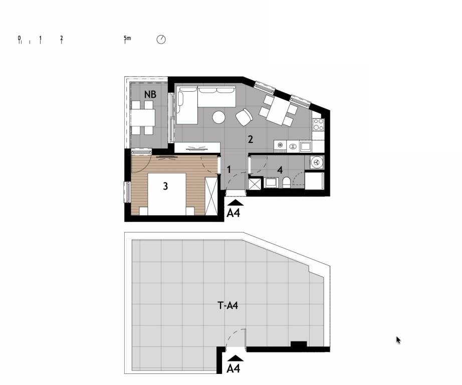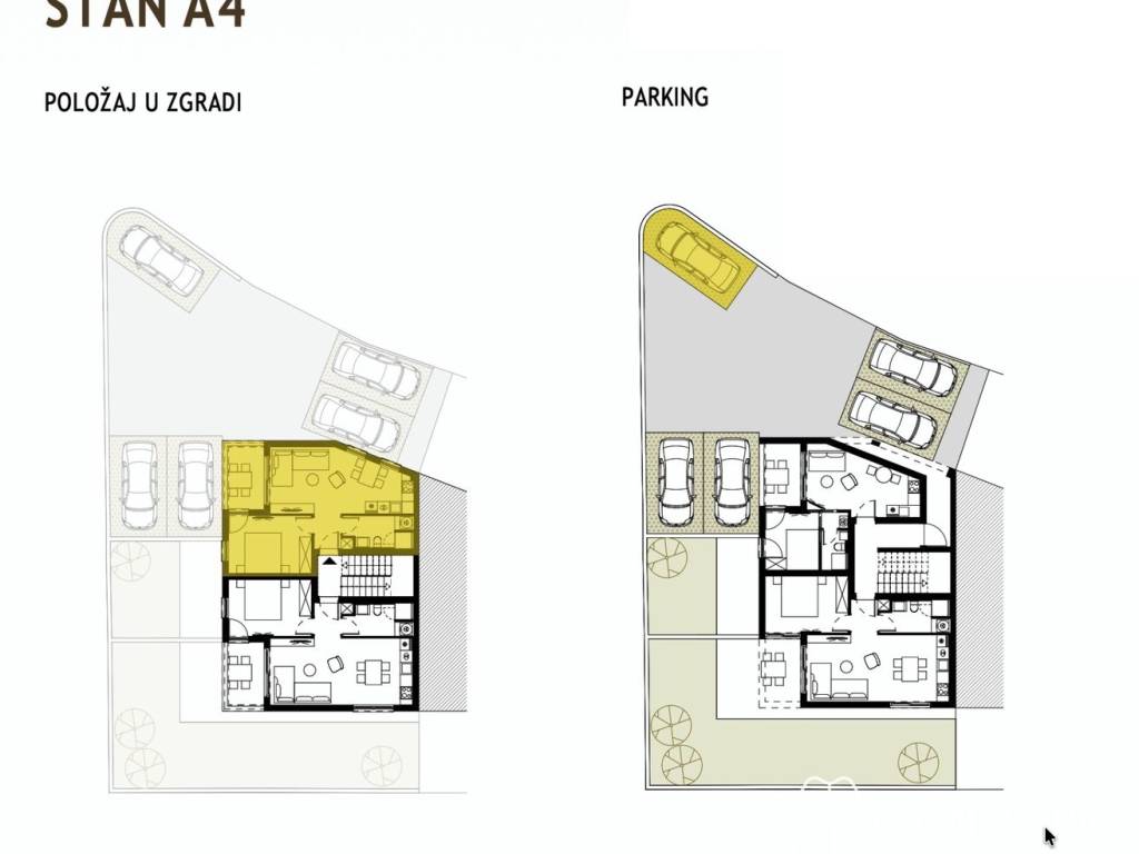 Проект состоит из двух двухквартирных жило-деловых зданий, объектов А и В, с общим количеством 10 квартир. Общая лестничная клетка находится в центре плана, каждая единица ориентирована с двух сторон и спроектирована таким образом, чтобы максимально использовать естественное освещение и открытые виды на море, с собственным внешним пространством в виде сада, балкона или лоджии.