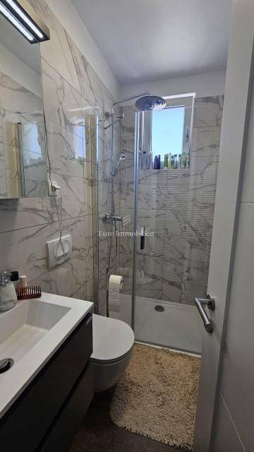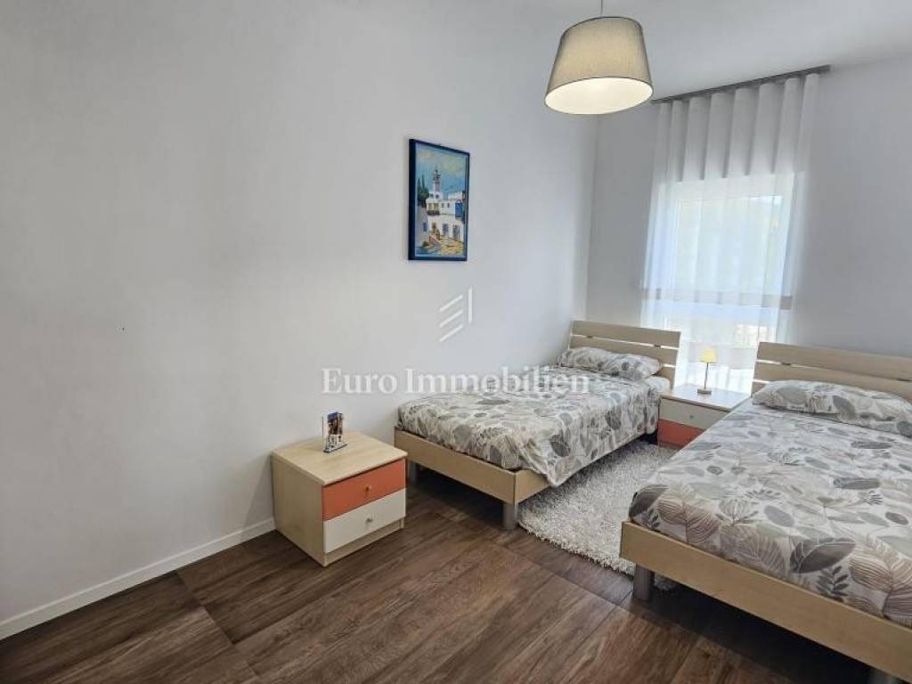 The penthouse is located on the first floor and consists of an entrance staircase, a hallway, 3 bedrooms, two bathrooms, a spacious living room, kitchen and dining room, and a large loggia. From the loggia, a covered staircase leads to the top, where there is a roof terrace with a panoramic view of the sea.
