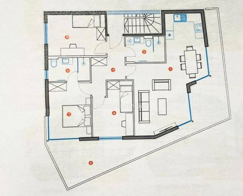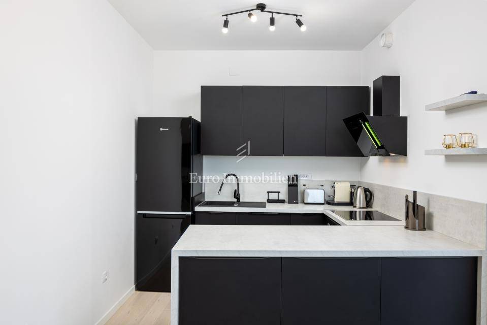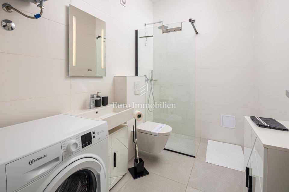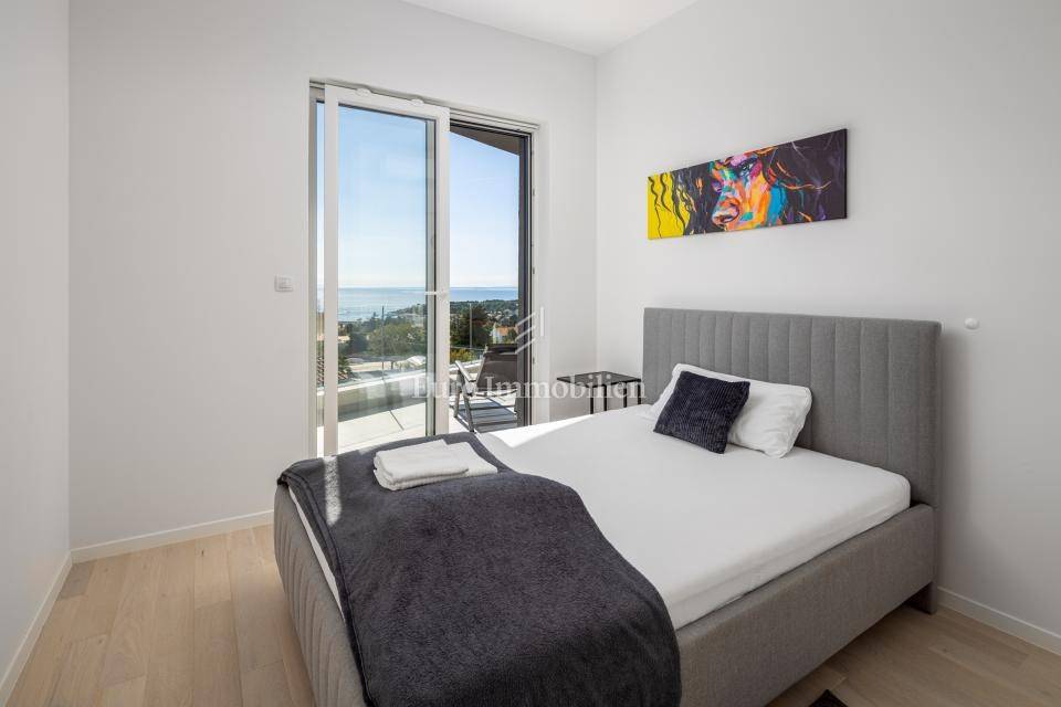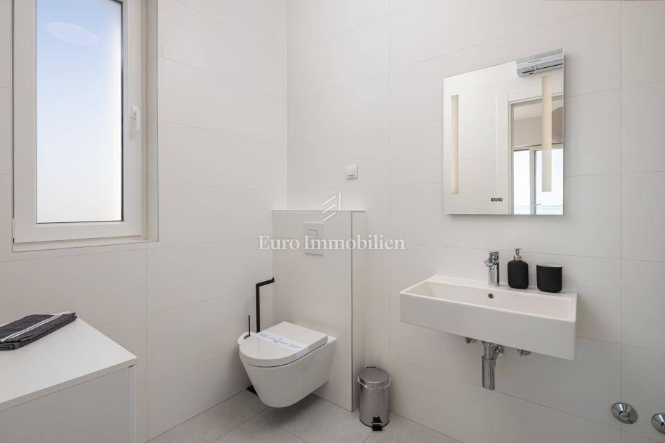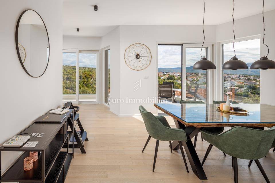 For sale is an apartment on the second floor of a residential building with only 4 apartments built in 2021. It extends through the entire second floor and consists of three bedrooms, two bathrooms, a hallway, an open concept room that unites the kitchen, dining and living room and a large terrace of 30 m2 with a view of the sea and the city of Krk. The apartment has two parking spaces. It is being sold fully equipped and furnished with quality furniture.