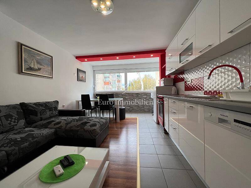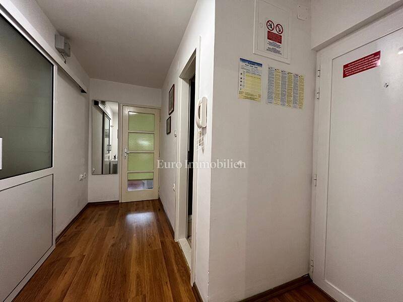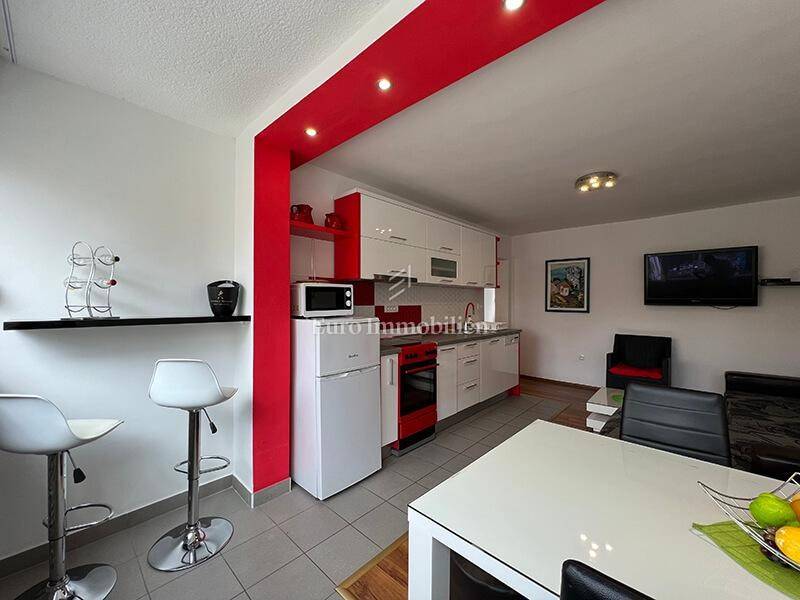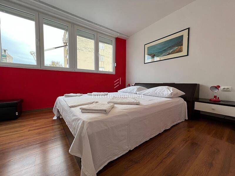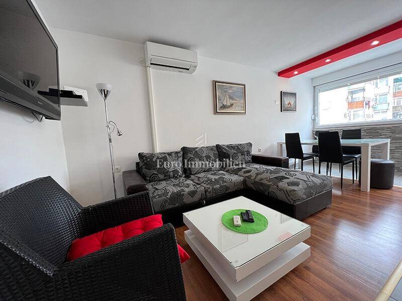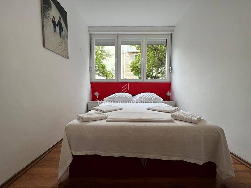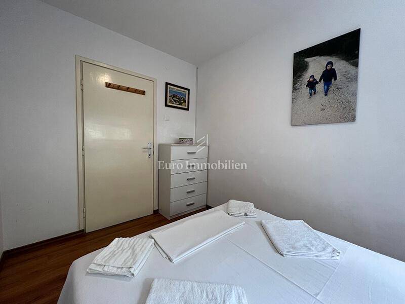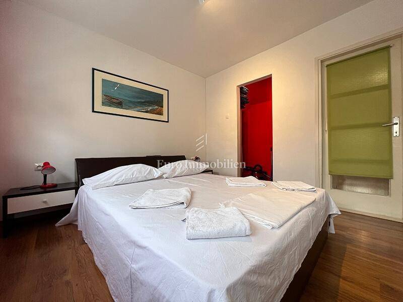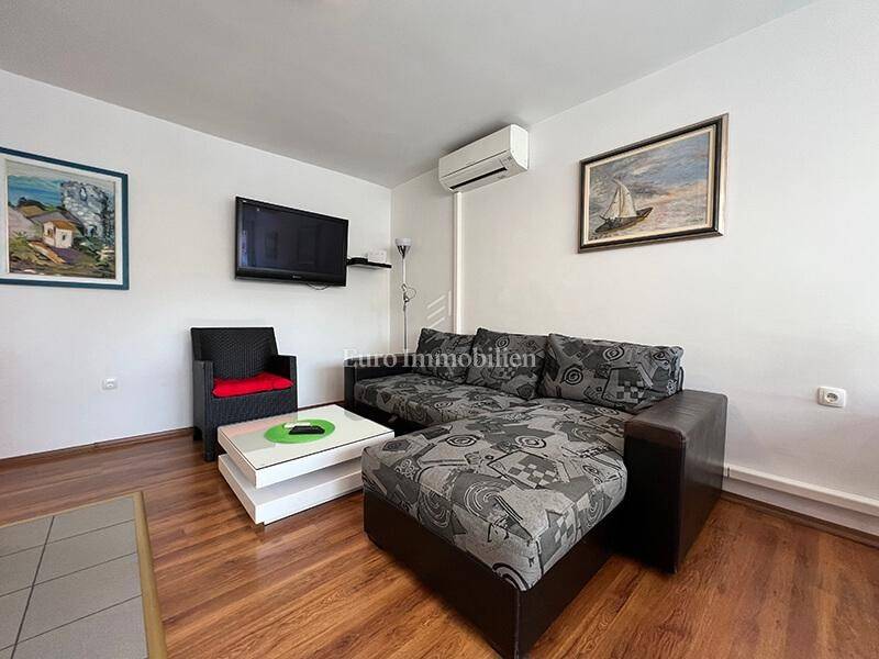 For sale is a ground floor apartment with two bedrooms, only 50 m from the waterfront. It can easily be converted into a business space. It consists of a kitchen, dining room, living room, hallway, bathroom, two bedrooms and a storage room in the basement of the building. It is air-conditioned, furnished and move in ready. There is a large common parking lot in front of the building. Ownership certificate and use permit.