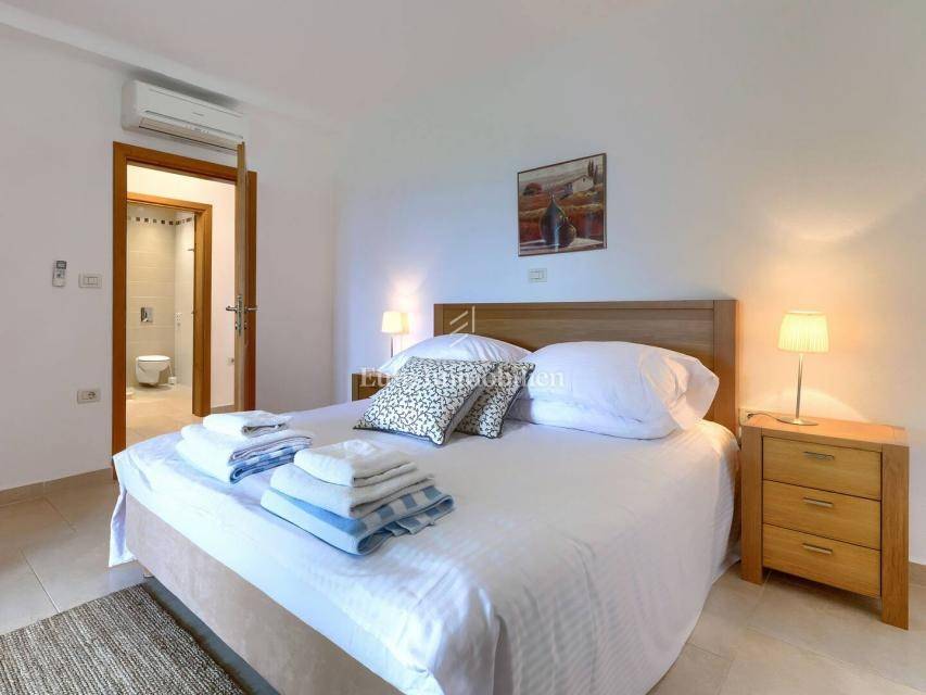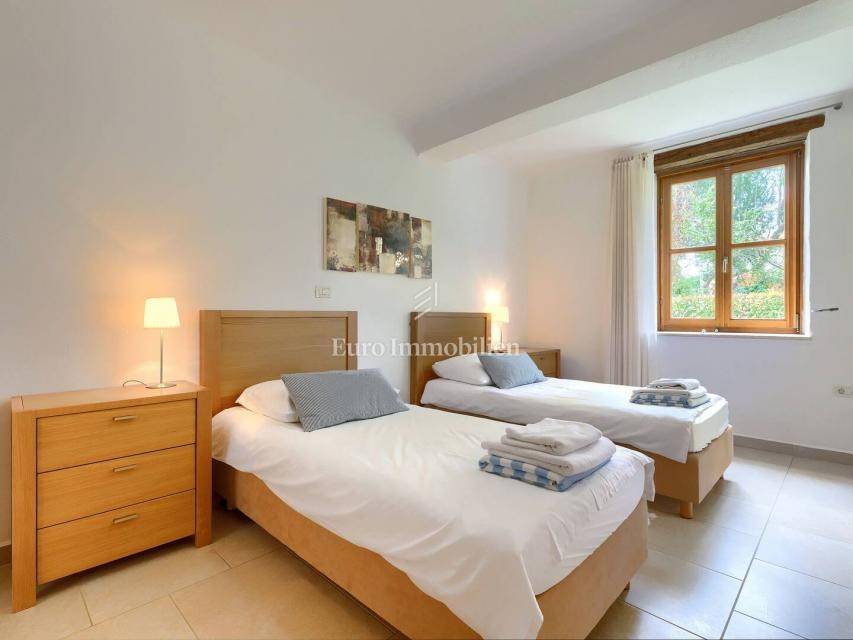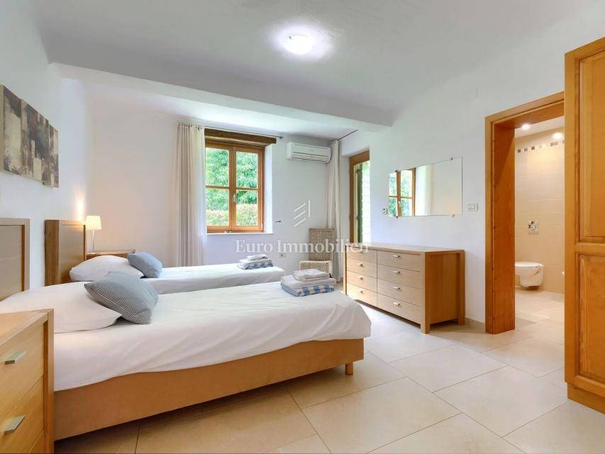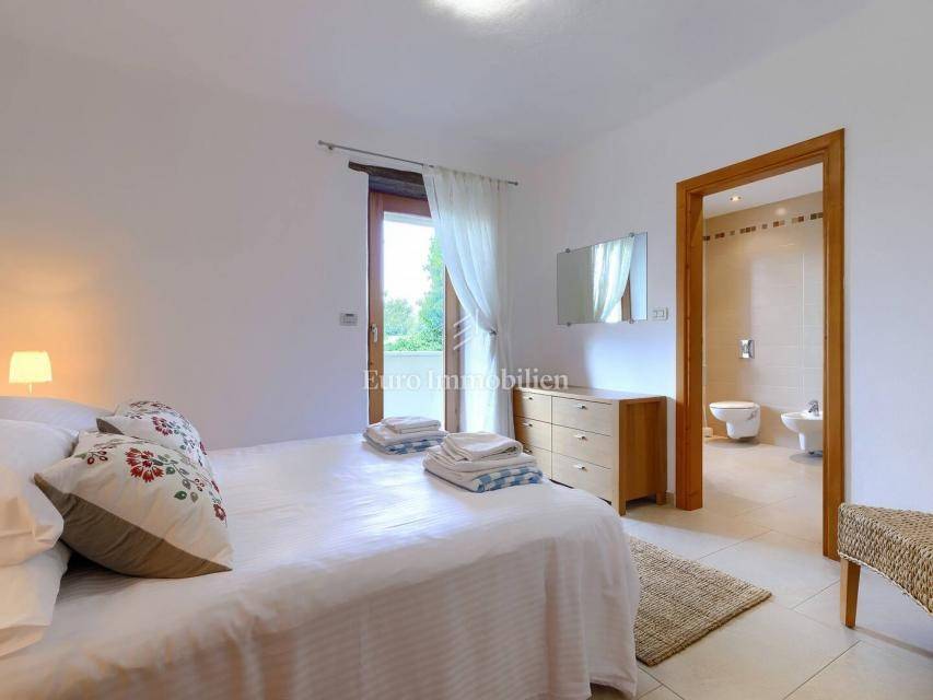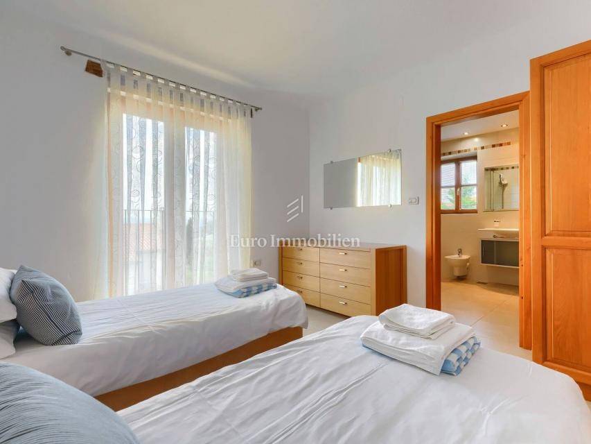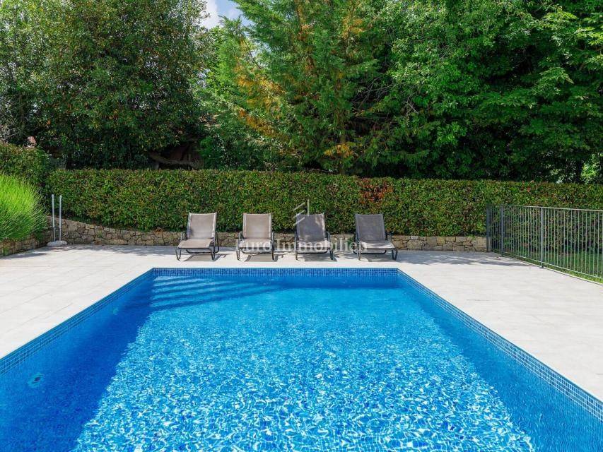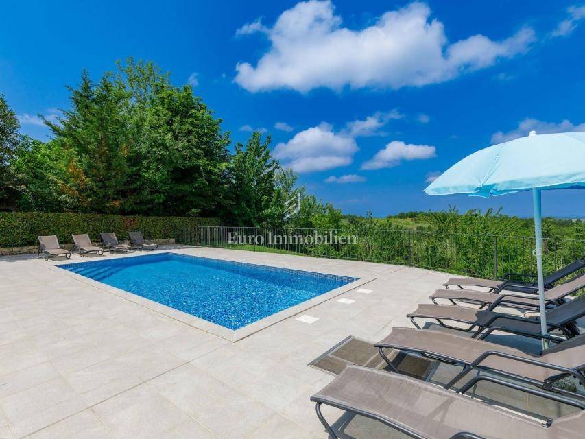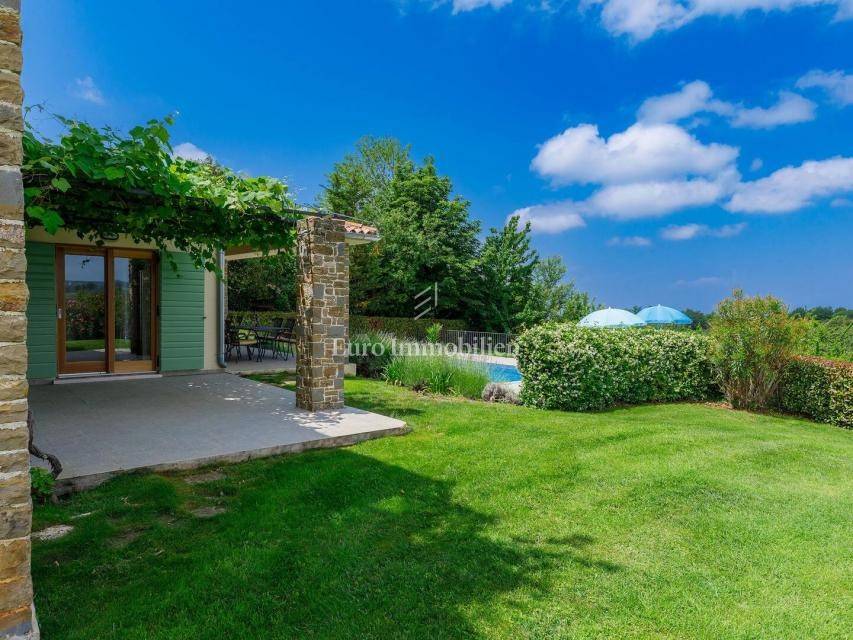 A beautiful detached house of 250 m² in a quiet part of Buje, built in 2010, offers five bedrooms and a spacious 1,270 m² plot with southwest orientation. The landscaped garden with a pool, barbecue, terrace and balcony provides a lovely view of the sea and nature.