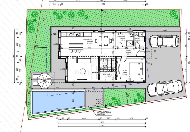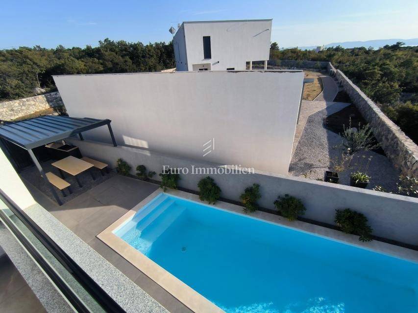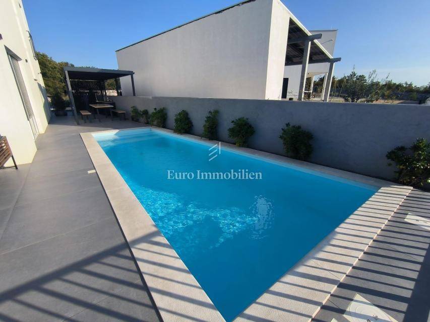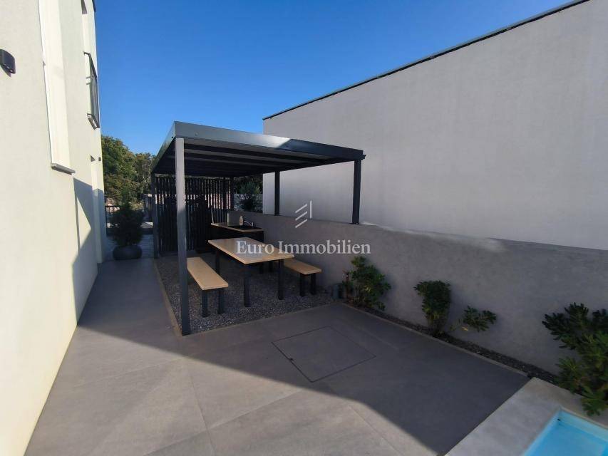 The house of 155 m2 extends over the ground floor and first floor. On the ground floor there is one bedroom, a bathroom, a kitchen and a large living room with a dining room that opens onto the terrace by the pool. A spacious staircase leads to the first floor where there are four bedrooms and two bathrooms. Schuco joinery, Hyundai inventory air conditioner, underfloor heating in the bathrooms, parquet floors throughout the house were installed. During the construction, the details were carefully selected, and the furniture was included. The house is in the final stage of construction.