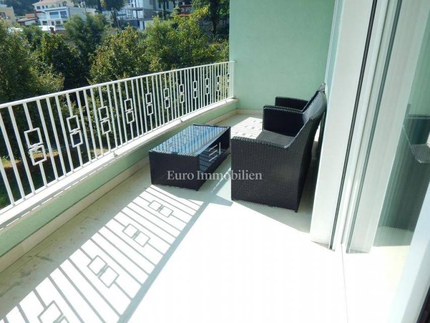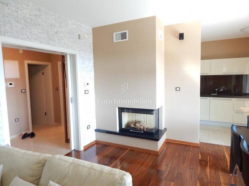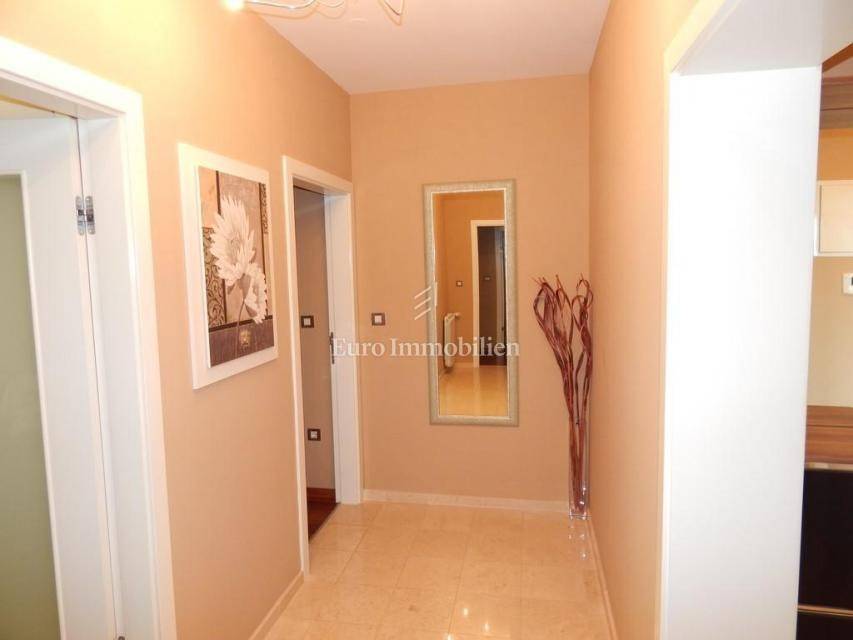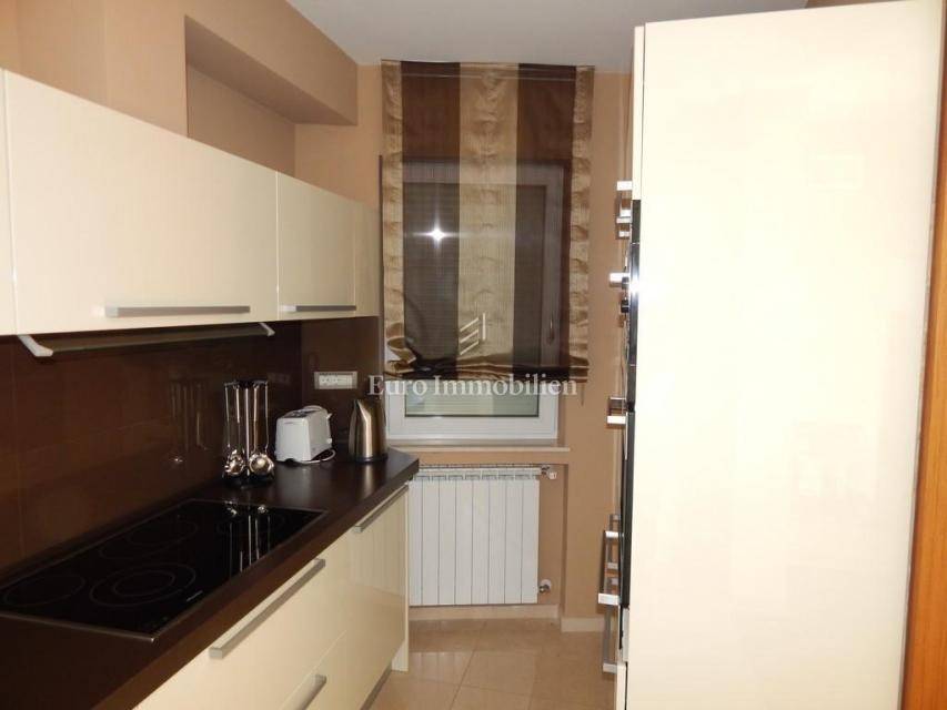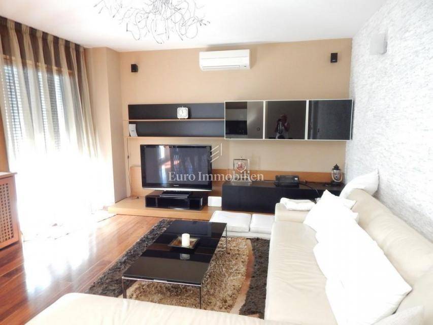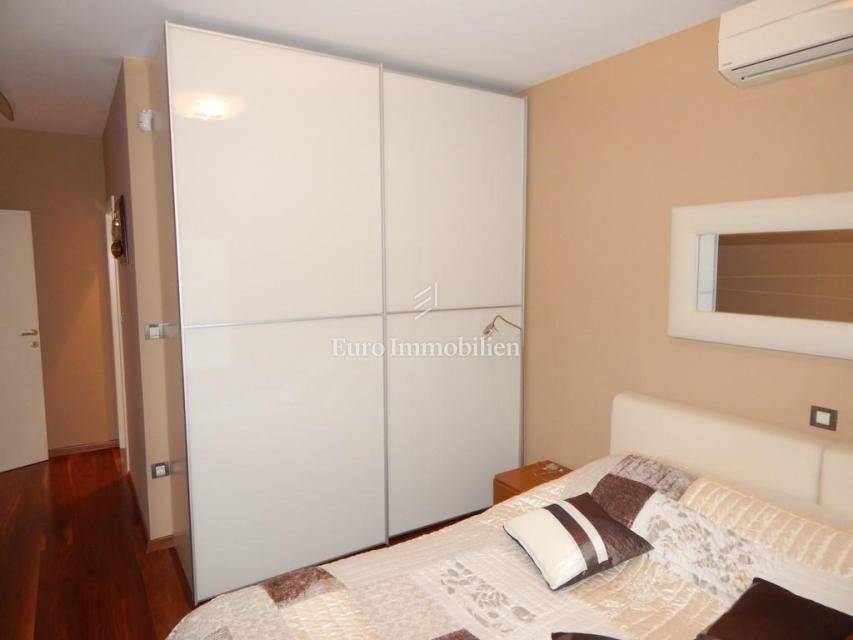 The apartment consists of: three bedrooms, hallway, living room with kitchen and dining room, two bathrooms, pantry, terrace and two loggias with a beautiful view of the sea. The apartment is equipped with gas-fired central heating, an alarm system, electric roller blinds, security doors and air conditioning. It is for sale furnished and equipped with high-quality furniture. The apartment has its own garage with a storage area of 28.30 m2. In the storage room there is an area with TV, kitchen and toilet. The building in which the apartment is located was built approximately 10 years ago, has a landscaped garden and a closed parking lot.