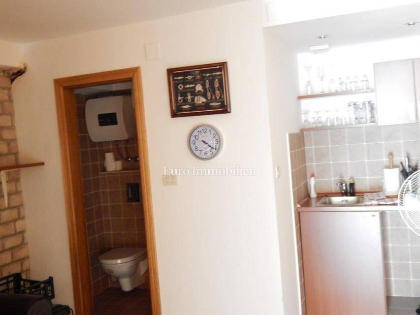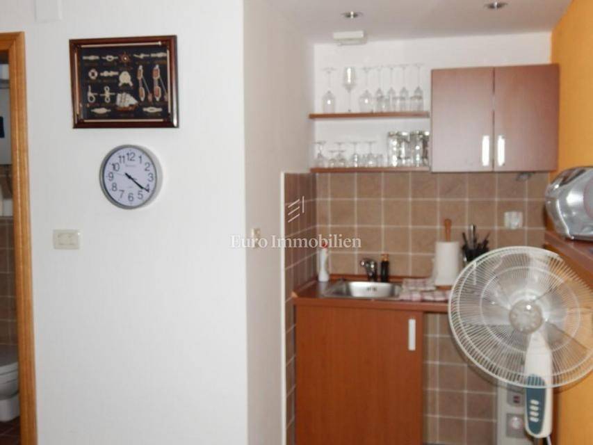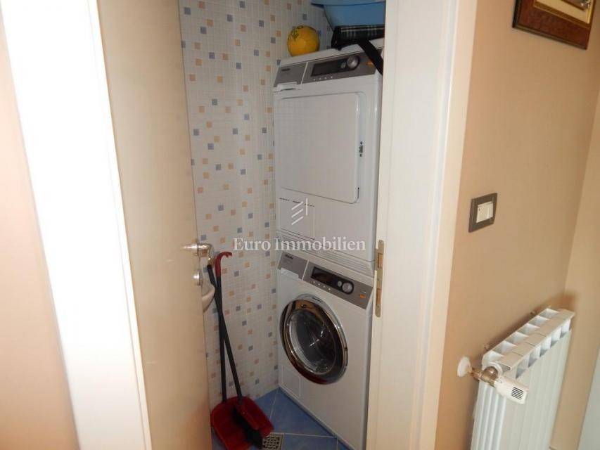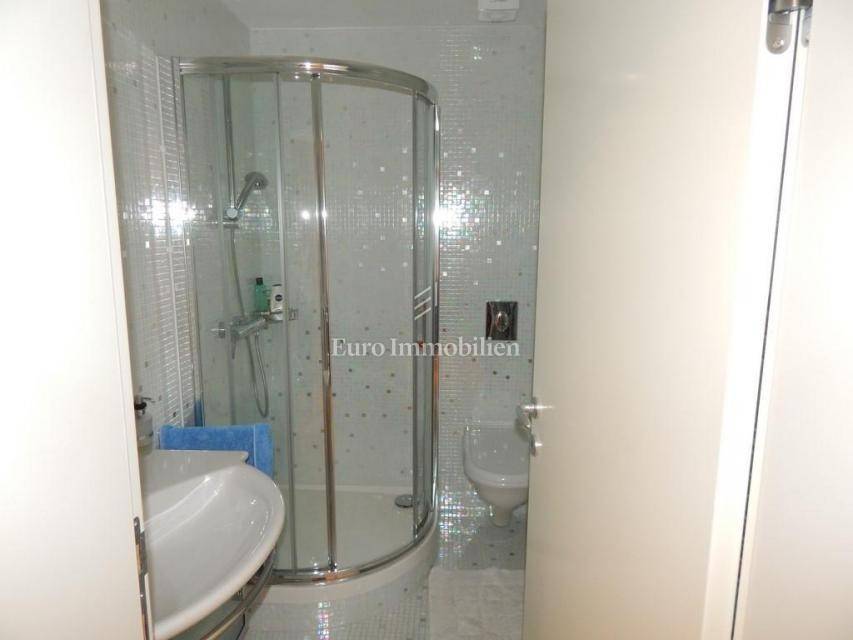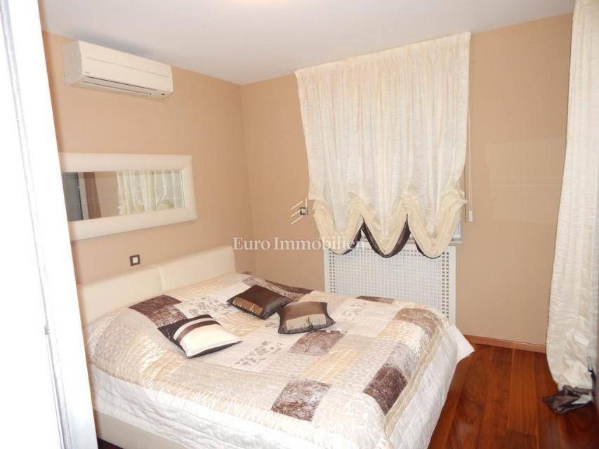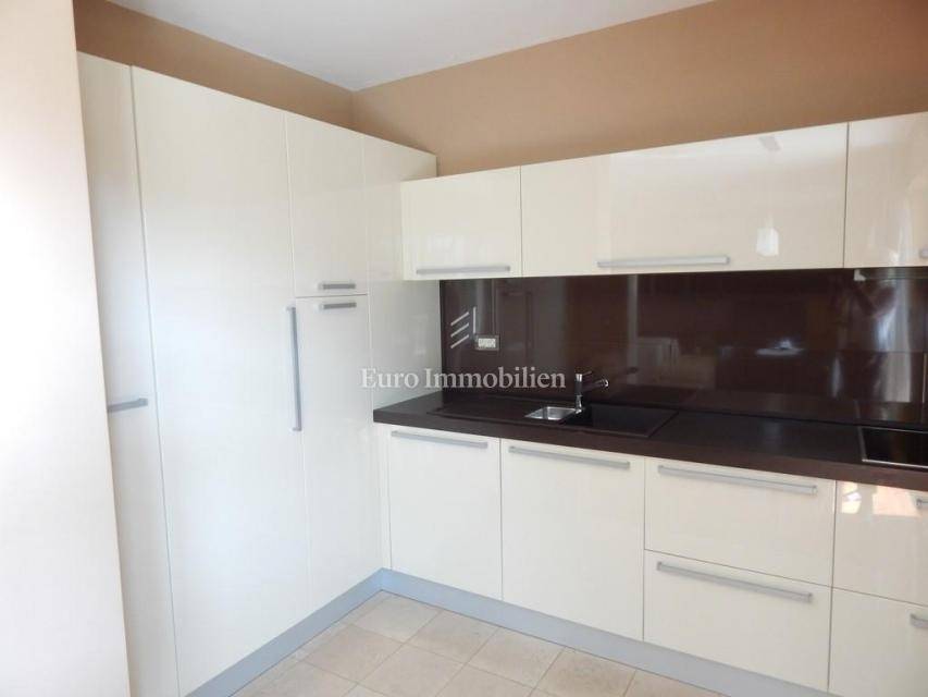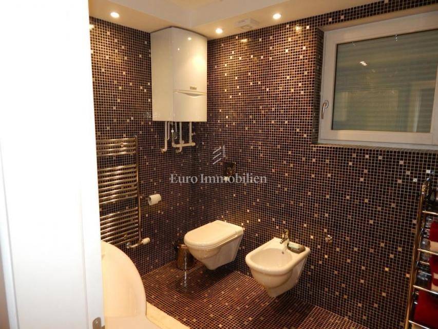 The apartment consists of: three bedrooms, hallway, living room with kitchen and dining room, two bathrooms, pantry, terrace and two loggias with a beautiful view of the sea. The apartment is equipped with gas-fired central heating, an alarm system, electric roller blinds, security doors and air conditioning. It is for sale furnished and equipped with high-quality furniture. The apartment has its own garage with a storage area of 28.30 m2. In the storage room there is an area with TV, kitchen and toilet. The building in which the apartment is located was built approximately 10 years ago, has a landscaped garden and a closed parking lot.