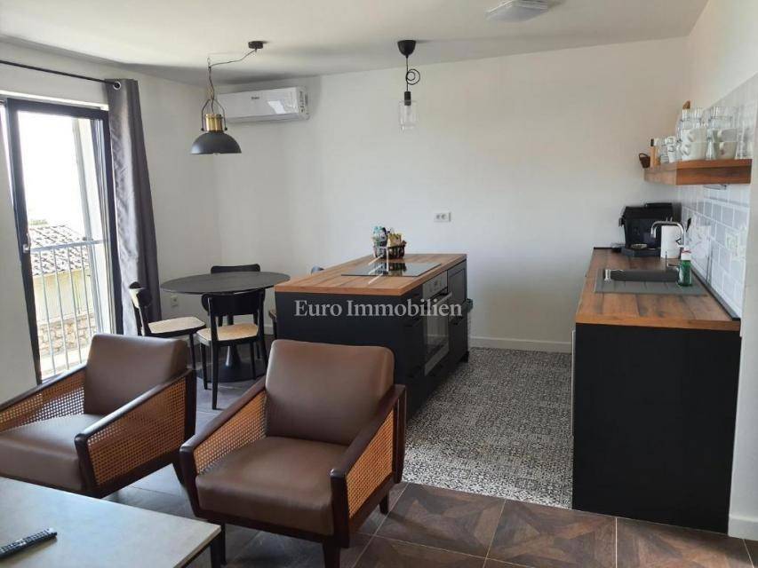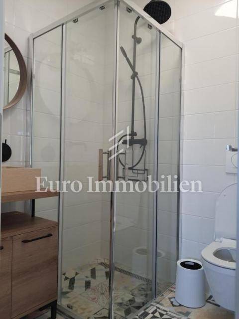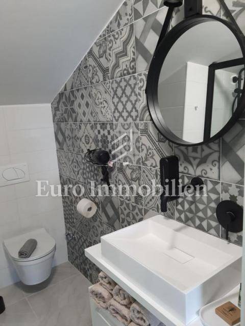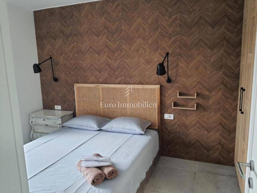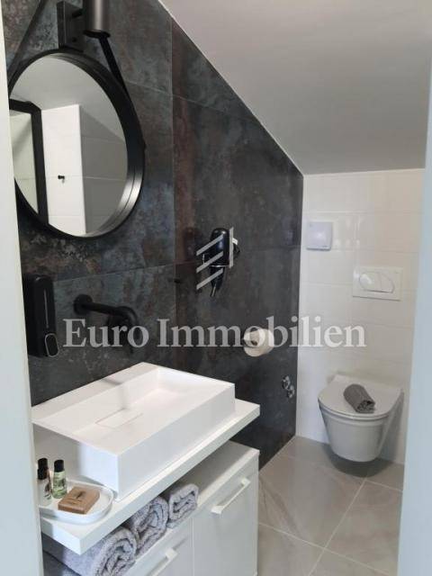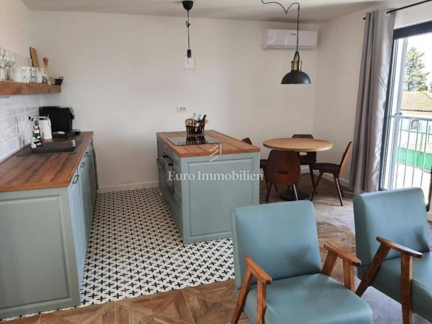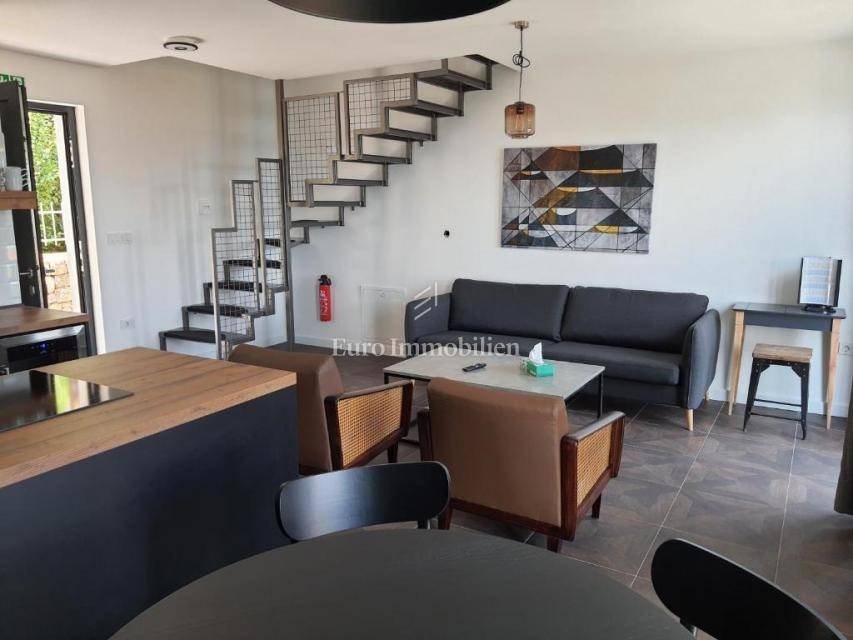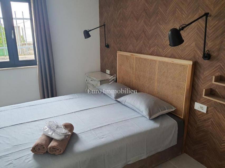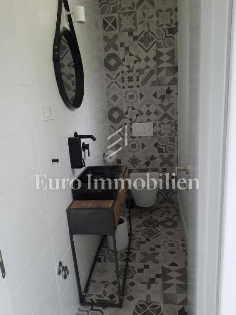 The house was completely renovated three years ago, it consists of three apartments that are used for tourism. On the ground floor of 71.5 m2 there is a two-room apartment with a living room, two bathrooms, a kitchen with a dining room and a living room, and a small storage room. There is a nice fenced terrace in front of the apartment. On the upper two floors there are identical two-story apartments, each 71.5 m2. Each apartment has an equipped kitchen, living room and toilet on the lower floor, and in the attic, which is reached by internal stairs, there is a room with a double bed and one extra bed, a gallery for another bed, and a bathroom. All apartments are decorated and furnished, have air conditioning, underfloor heating and a solar water heating system. In front of them is a large terrace. Behind the house is a storage room and a utility room with a common water heater and a toilet of 37.6 m2. There is parking for three vehicles in front of the house.