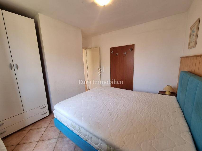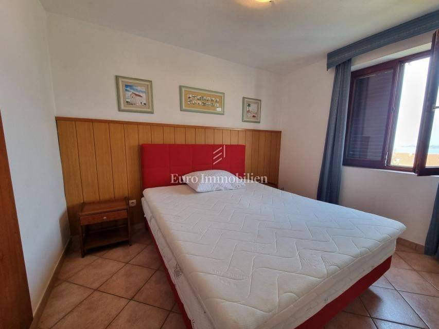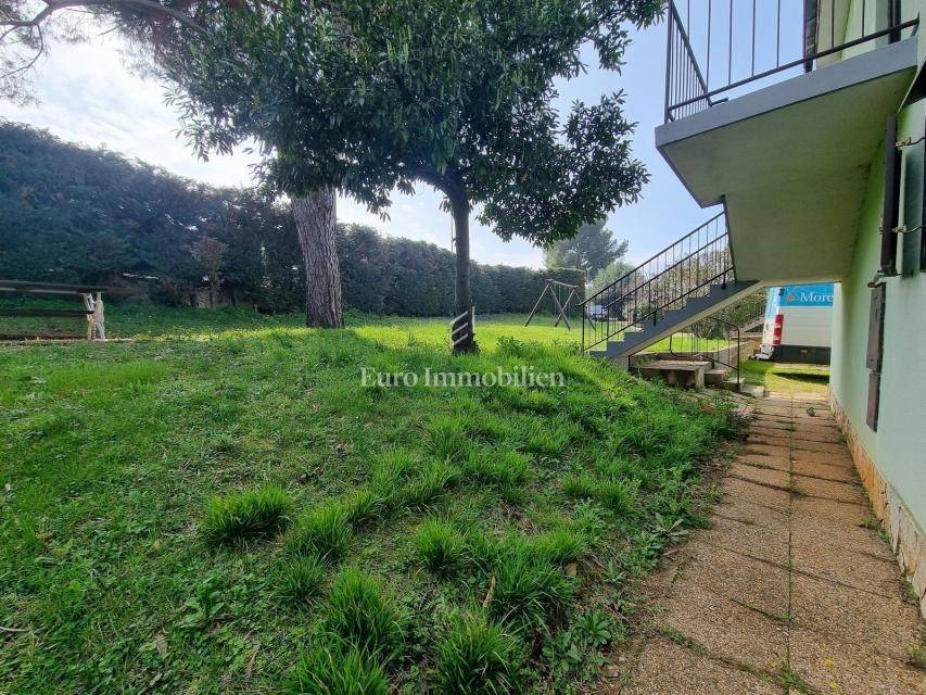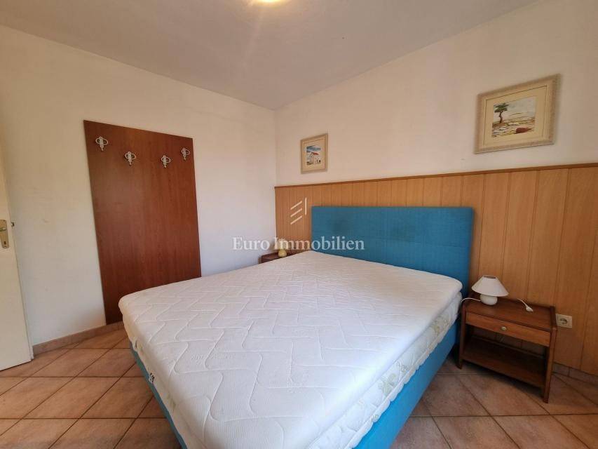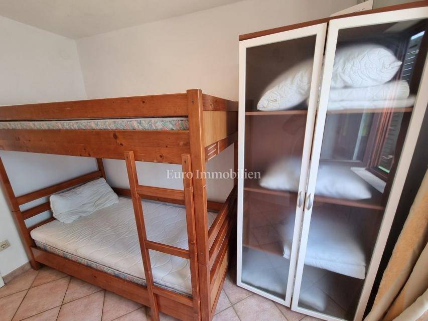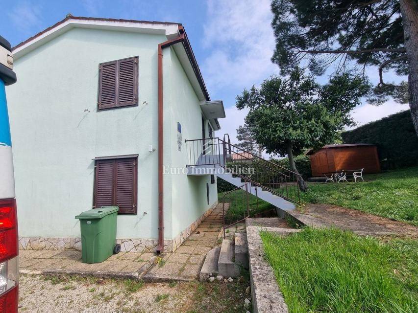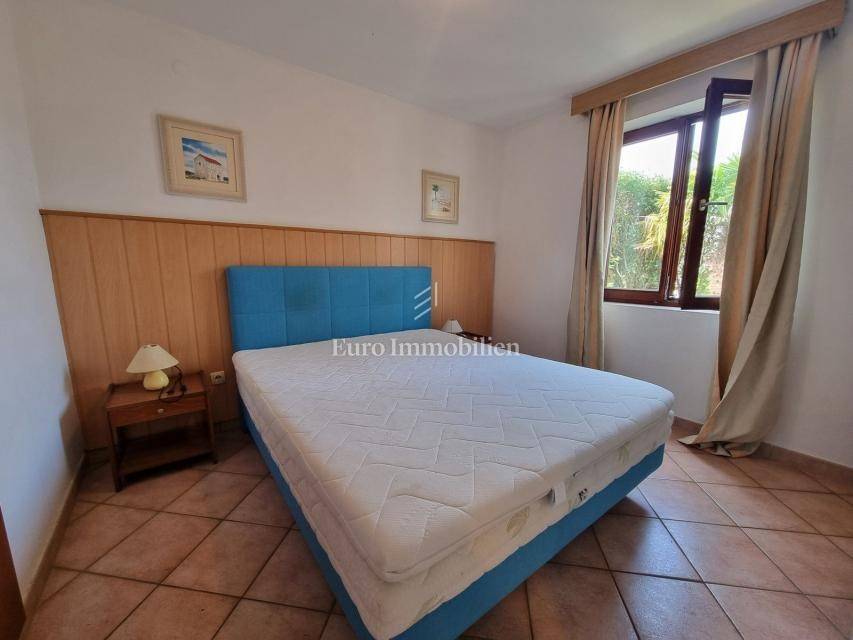 The house extends over the ground floor and first floor. On the ground floor there is an apartment of 59.61 m2 with a terrace, consisting of a hallway, two bedrooms, a bathroom, a living room with a dining room and a kitchen. From the living room there is access to a spacious covered terrace and garden. The external stairs lead to the apartment on the first floor of the same square footage and layout. From the first floor there is a beautiful view of the sea from the bedrooms, the living room and the balcony. The apartments need minor renovation, but they are functional and are rented for tourist purposes. Heating/cooling is via air conditioning. The house has 369 m2 of garden with a barbecue and parking.