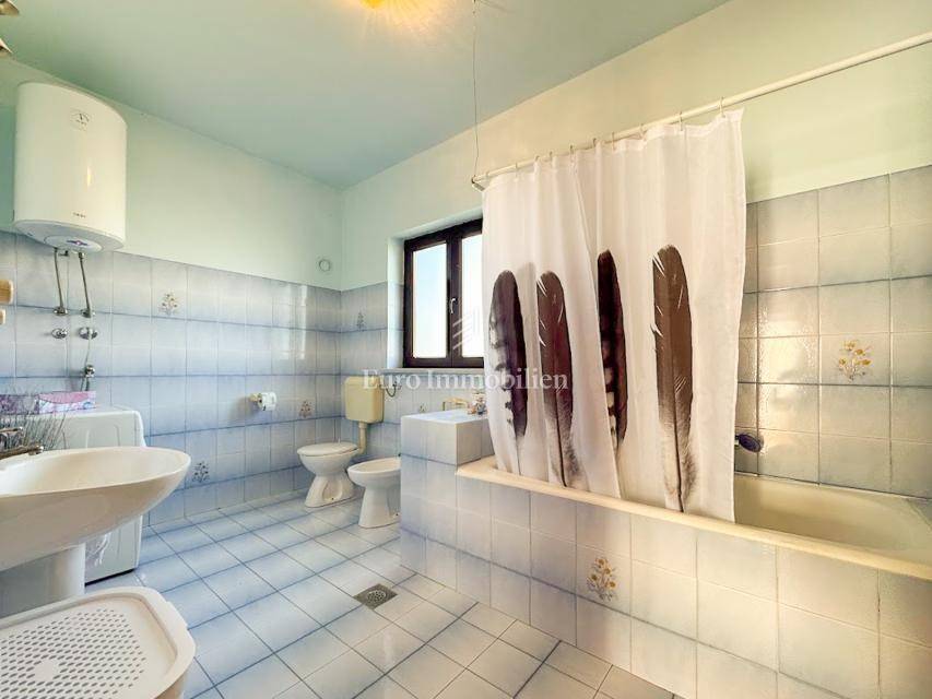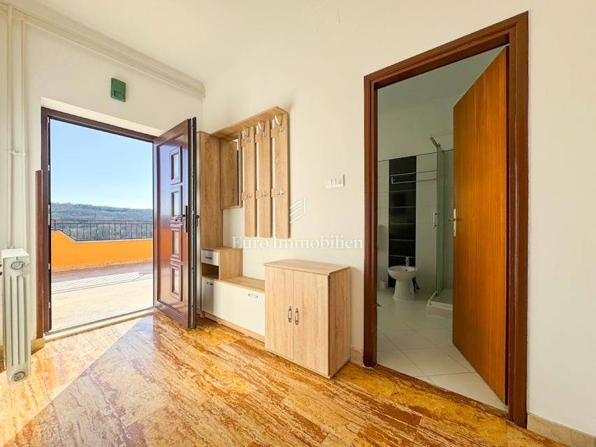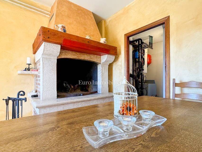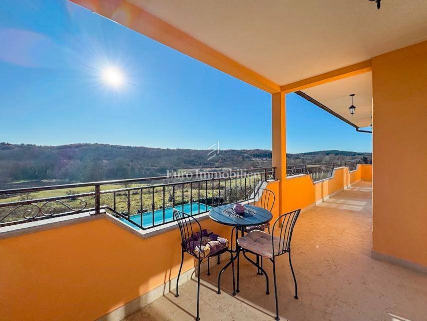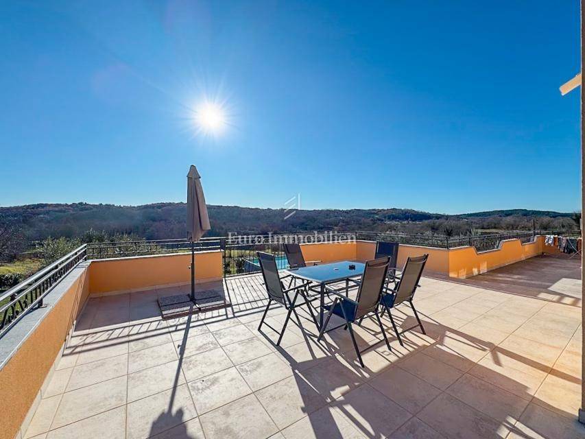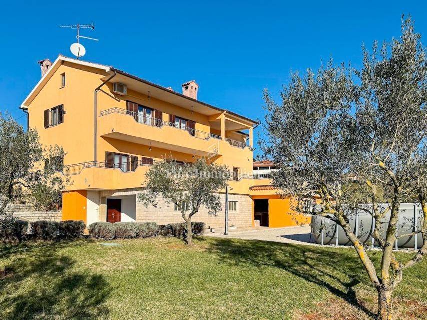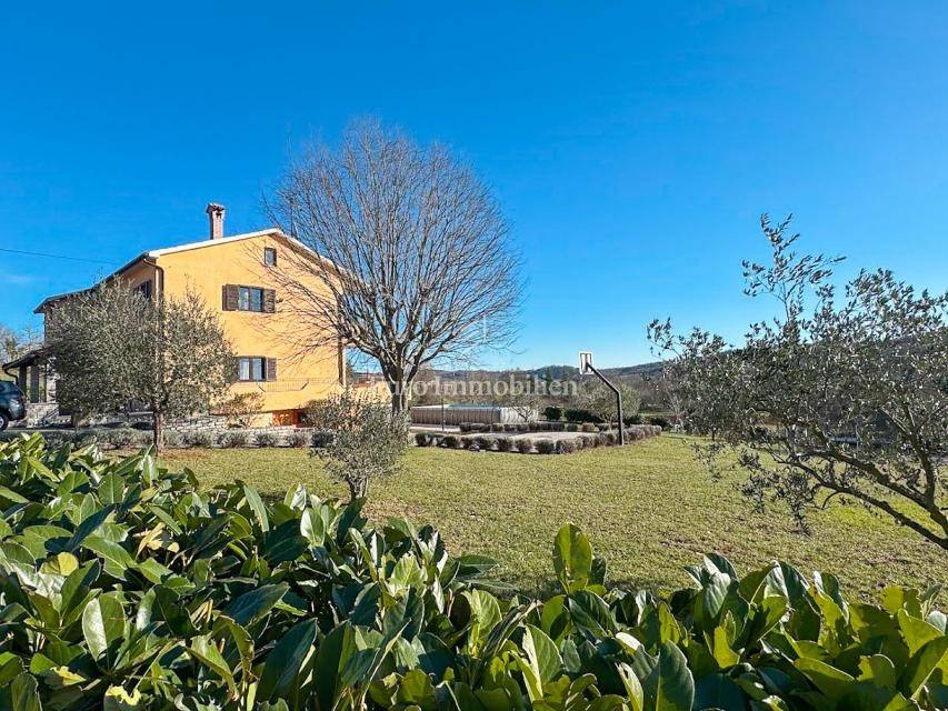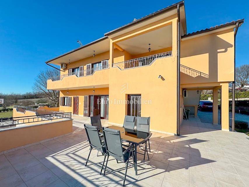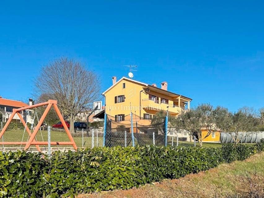 House in a peaceful setting in central Istria. In the basement there are two garages, a cellar and a storage room. On the ground floor of the house there is the first apartment consisting of a living room, kitchen with dining room, bedroom, bathroom and a spacious covered terrace. On the ground floor there is also a cellar, boiler room and storage room. On the first floor there is a second apartment consisting of a kitchen with dining room and living room, three bedrooms, bathroom and a covered terrace. The house is equipped with a prefabricated swimming pool measuring 10 × 5 m with an outdoor shower, and there is also a spacious parking space for several vehicles. For lovers of outdoor activities there is an outdoor barbecue, ideal for summer evenings with family and friends. Central heating with an oil boiler room allows for a pleasant stay during the winter, while four air conditioners guarantee pleasant temperatures in the summer months.