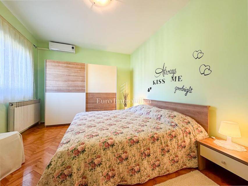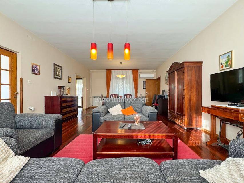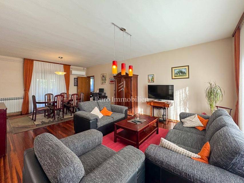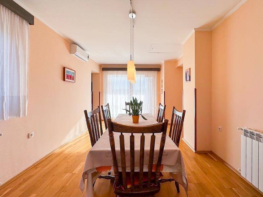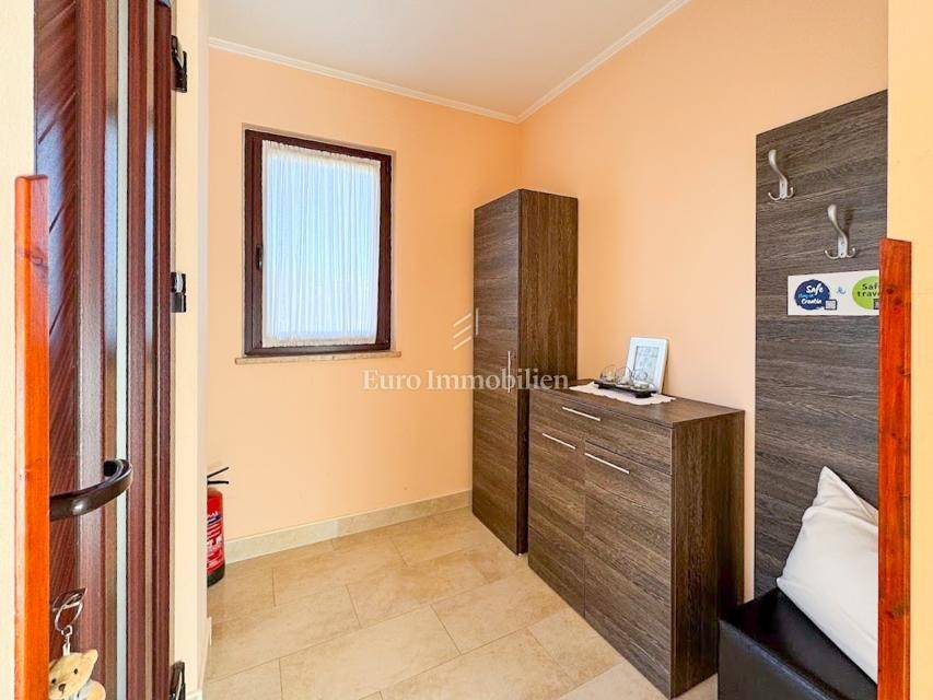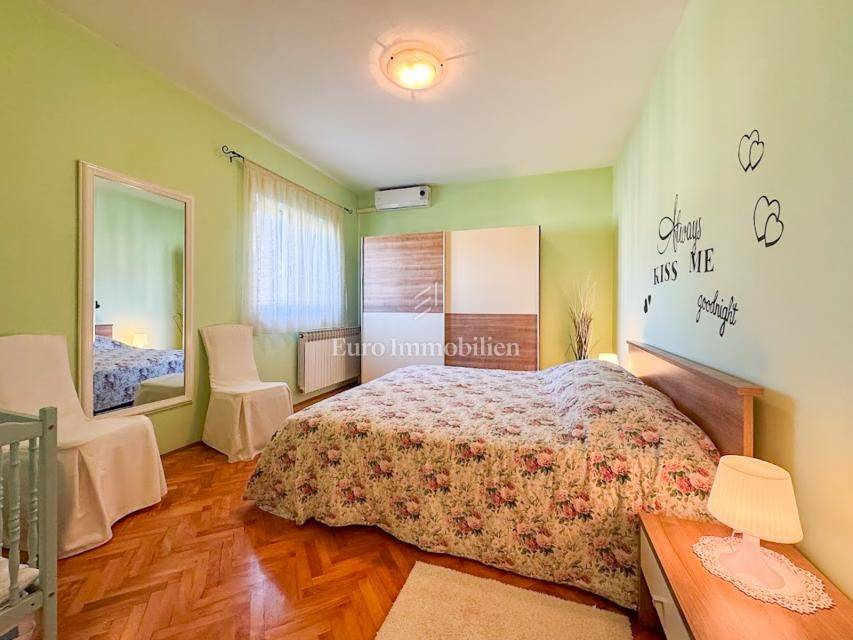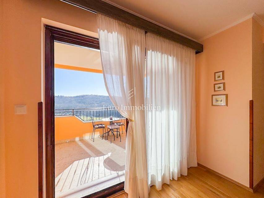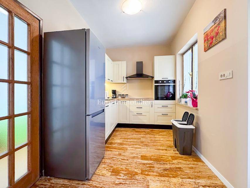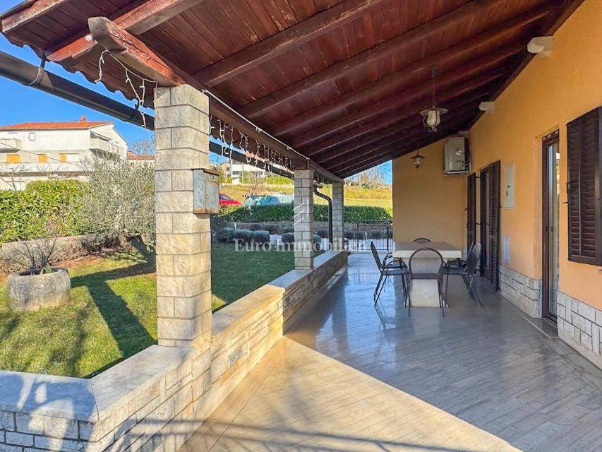 House in a peaceful setting in central Istria. In the basement there are two garages, a cellar and a storage room. On the ground floor of the house there is the first apartment consisting of a living room, kitchen with dining room, bedroom, bathroom and a spacious covered terrace. On the ground floor there is also a cellar, boiler room and storage room. On the first floor there is a second apartment consisting of a kitchen with dining room and living room, three bedrooms, bathroom and a covered terrace. The house is equipped with a prefabricated swimming pool measuring 10 × 5 m with an outdoor shower, and there is also a spacious parking space for several vehicles. For lovers of outdoor activities there is an outdoor barbecue, ideal for summer evenings with family and friends. Central heating with an oil boiler room allows for a pleasant stay during the winter, while four air conditioners guarantee pleasant temperatures in the summer months.