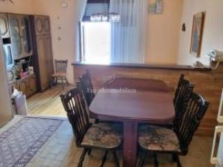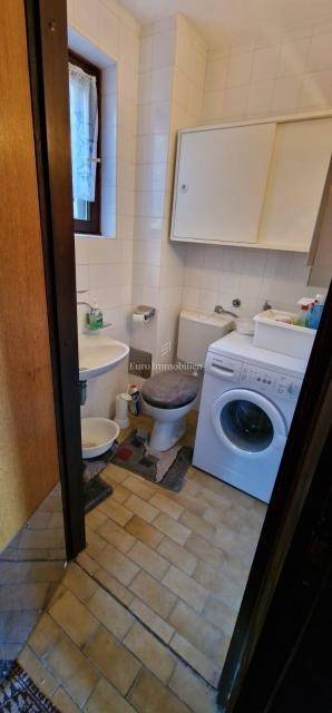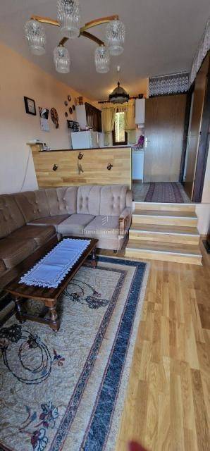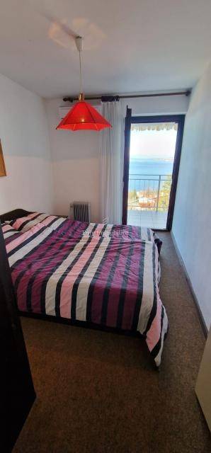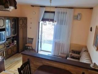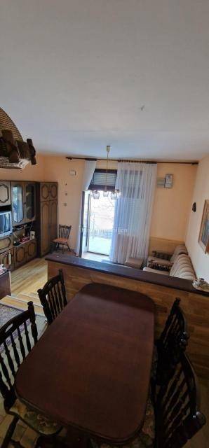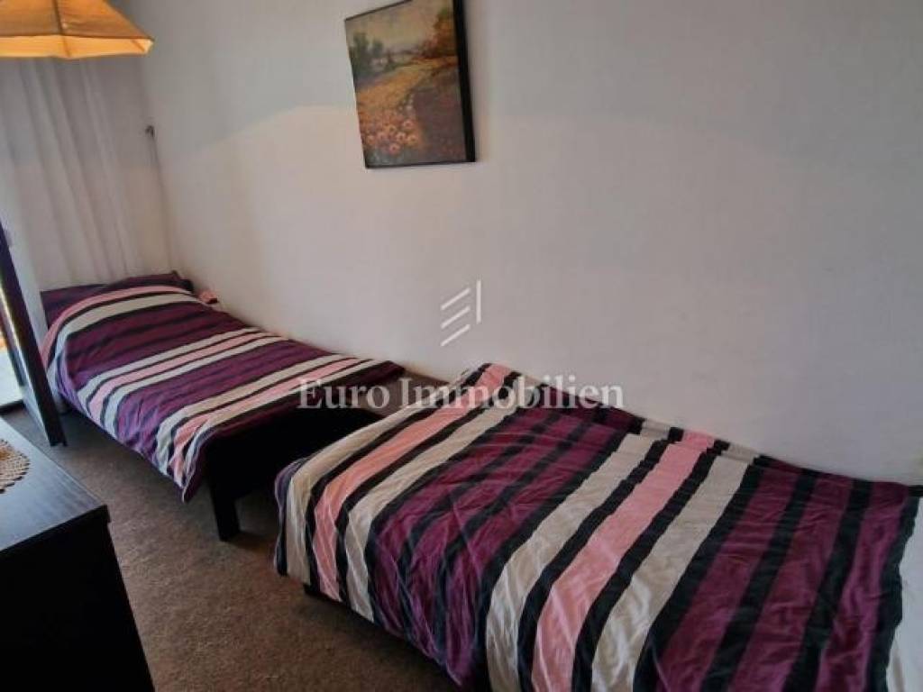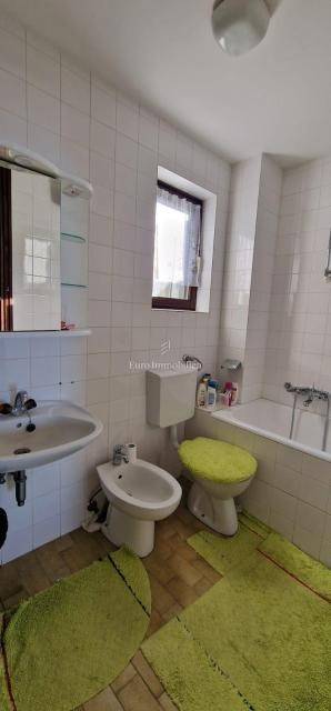 The apartment is located on the first floor of a semi-detached house, and consists of a living room, a kitchen with a dining room and a toilet. The living room leads to a small covered terrace with a fireplace. On the upper floor there are three bedrooms and a bathroom, and both balconies offer a view of the sea, which is only 300 meters away. The apartment comes with a garage with a basement. Purchases are possible only for cash.