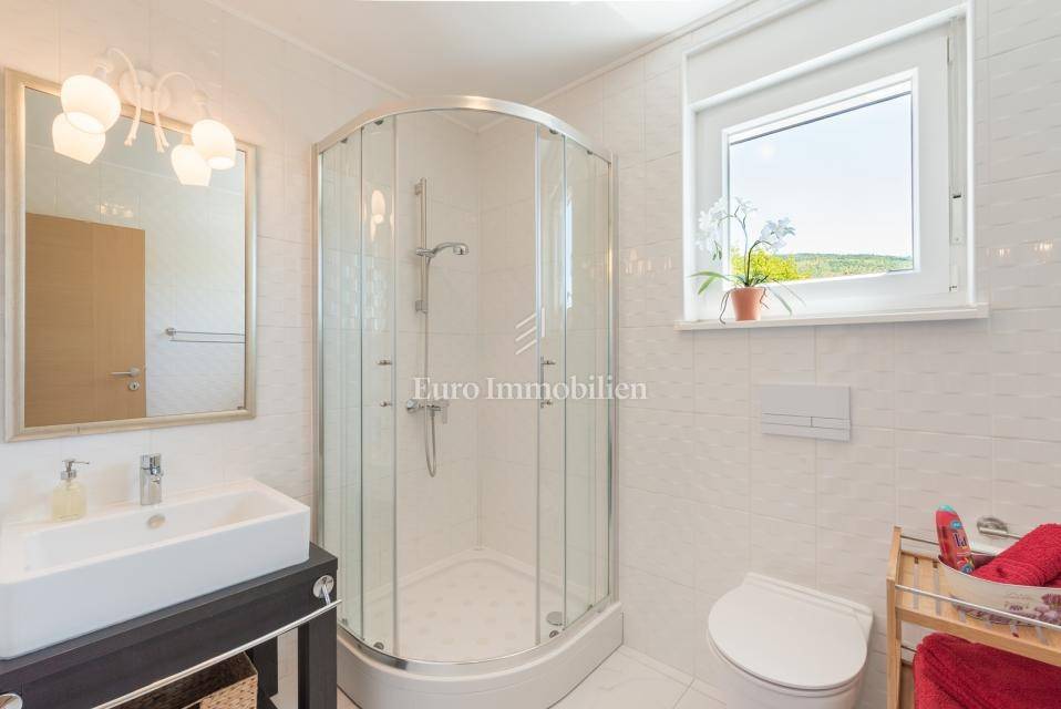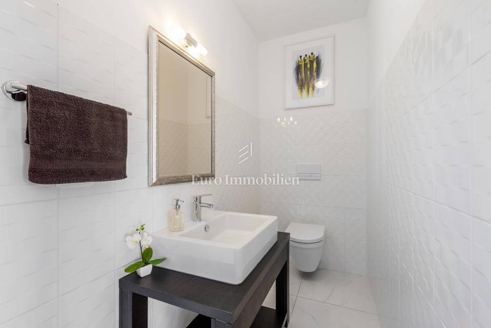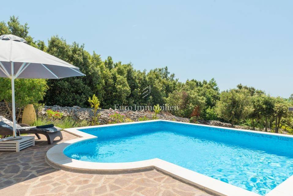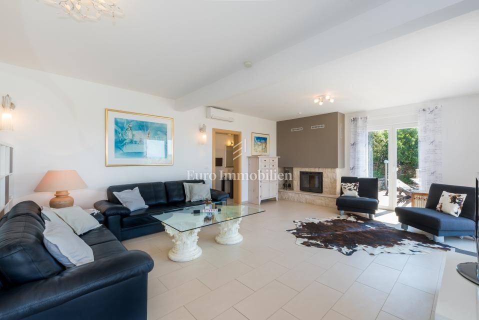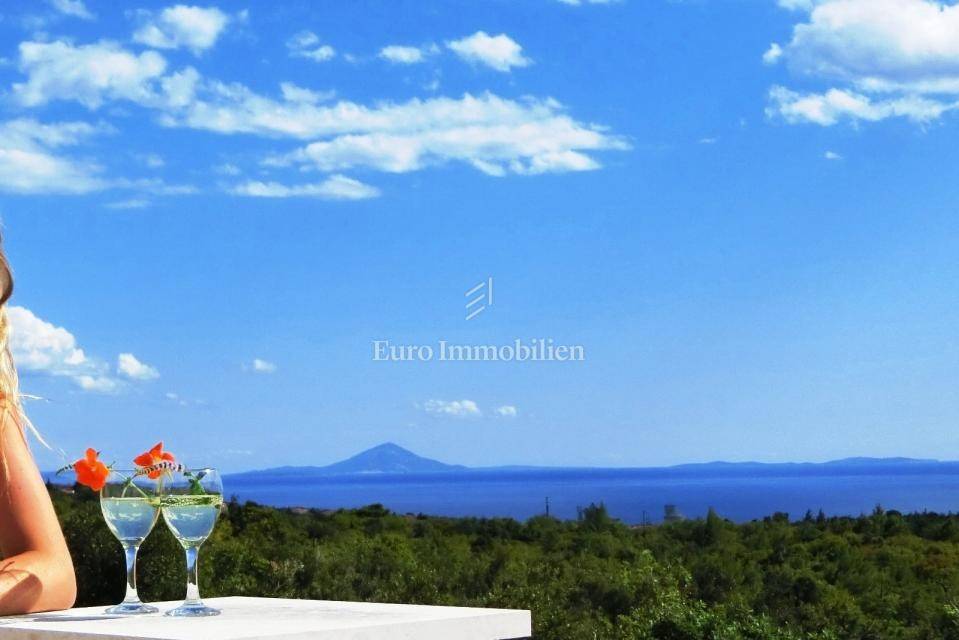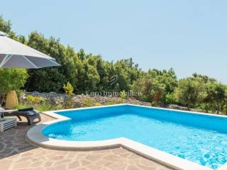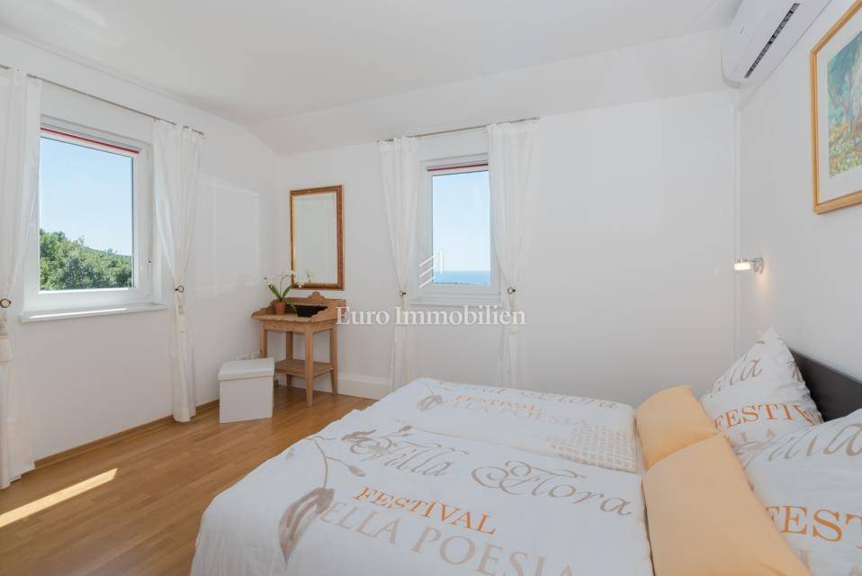 The house consists of: Ground floor, where there is a spacious kitchen with dining room and living room with large glass walls, exit to the terrace with an incredible view, guest toilet, storage room and pantry, and the first floor, where there are three spacious bedrooms and two bathrooms, with exit to the terrace with an open view of the sea. Each room is equipped with air conditioning. There is a swimming pool with a sunbathing area in the garden. The house also has a storage room, garage and an additional building that can be adapted to the needs of the buyer, depending on the wishes.