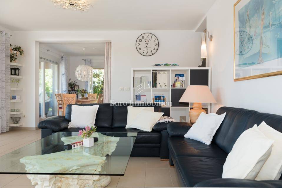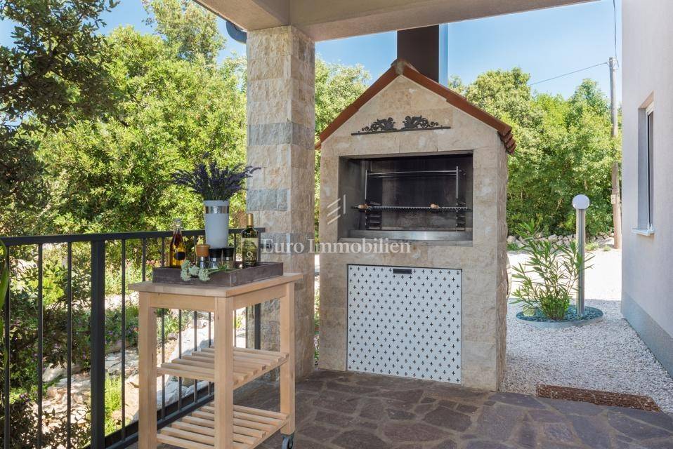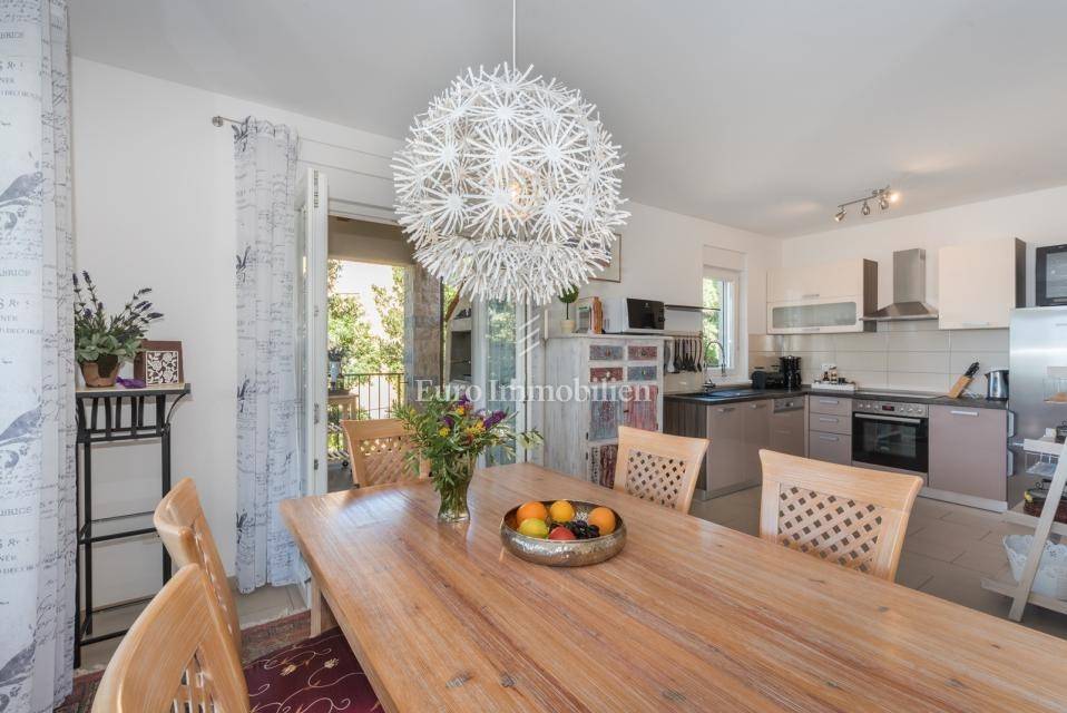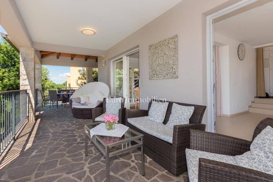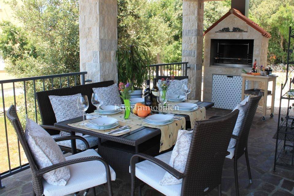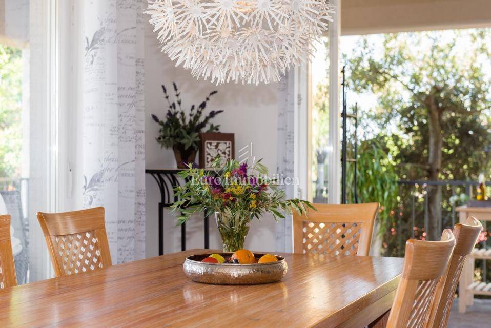 The house consists of: Ground floor, where there is a spacious kitchen with dining room and living room with large glass walls, exit to the terrace with an incredible view, guest toilet, storage room and pantry, and the first floor, where there are three spacious bedrooms and two bathrooms, with exit to the terrace with an open view of the sea. Each room is equipped with air conditioning. There is a swimming pool with a sunbathing area in the garden. The house also has a storage room, garage and an additional building that can be adapted to the needs of the buyer, depending on the wishes.