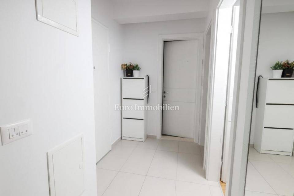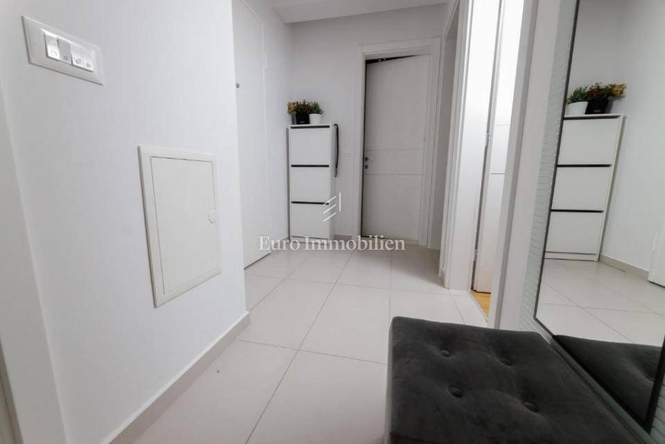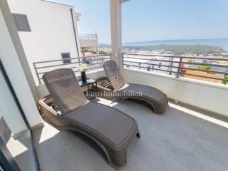 Attractive three-bedroom apartment with a garage above the center of Makarska with an open view of the sea. The apartment is extremely rarely used, almost new and ready to move in immediately. It has an area of 91 m2 and is located on the second floor of a recently built urban villa. The apartment has a spacious garage of 19.29 m2 and two storage rooms of 5 m2.