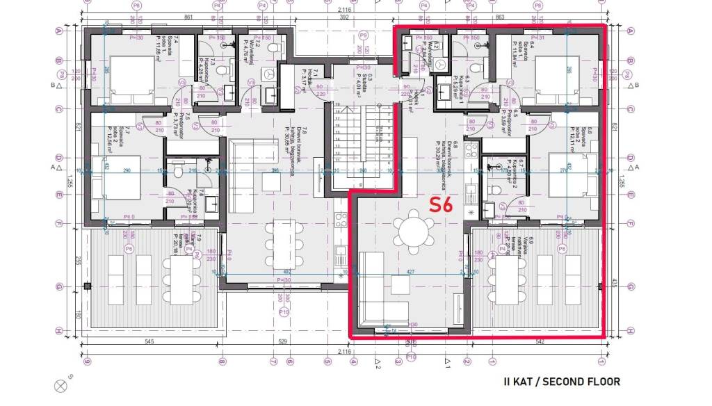 Квартира S6 находится на втором этаже здания и имеет общую полезную площадь 98,40 м2 (с учётом коэффициентов).