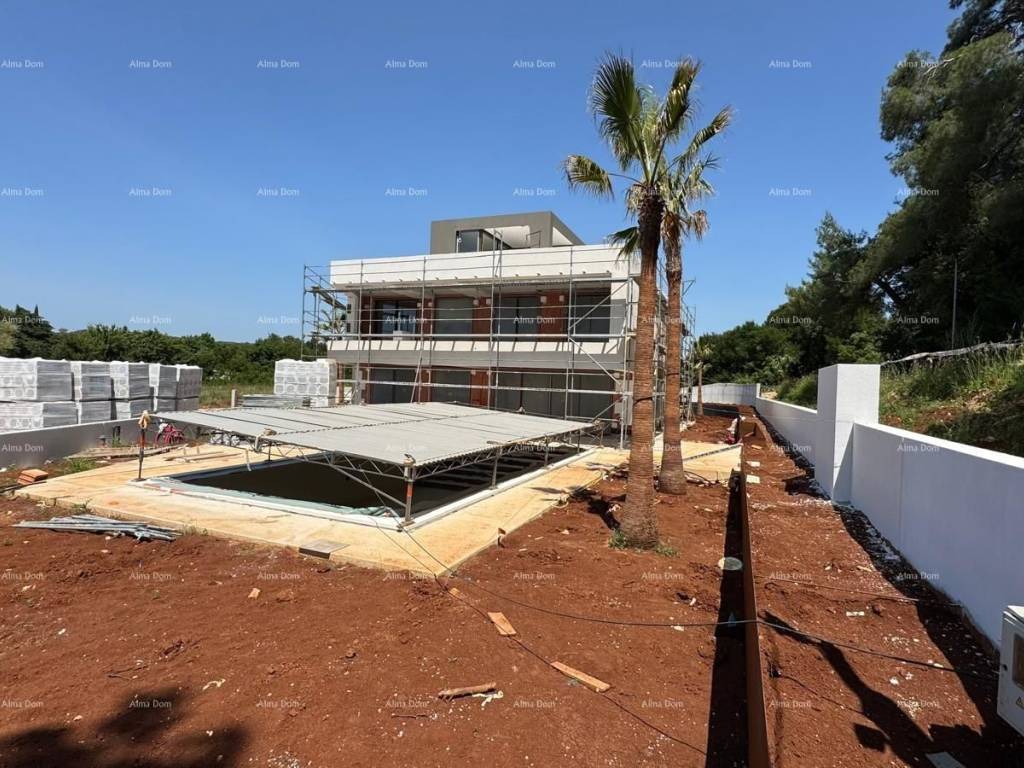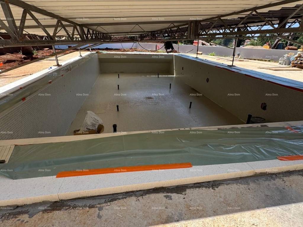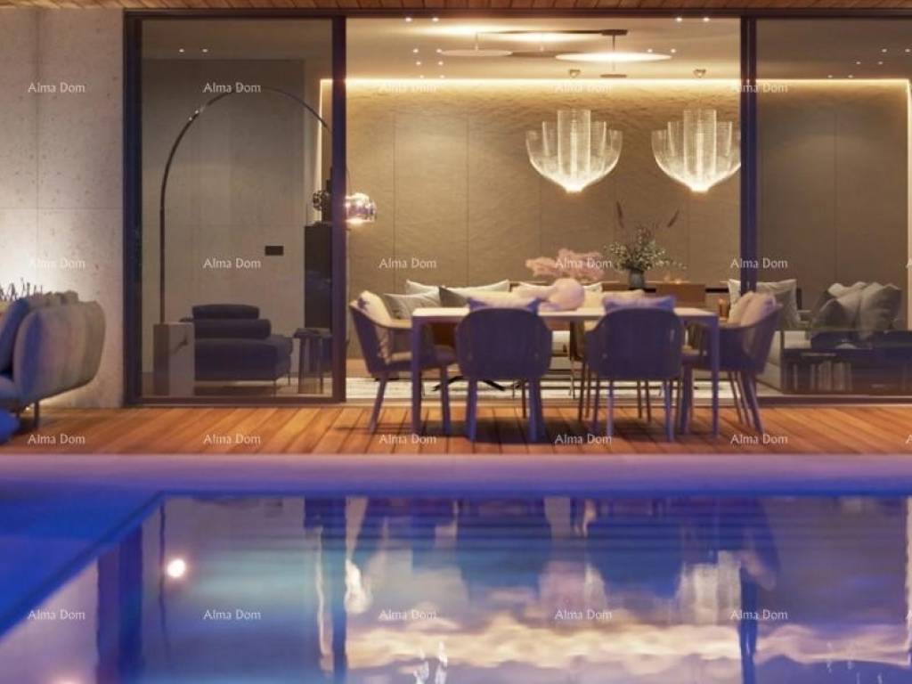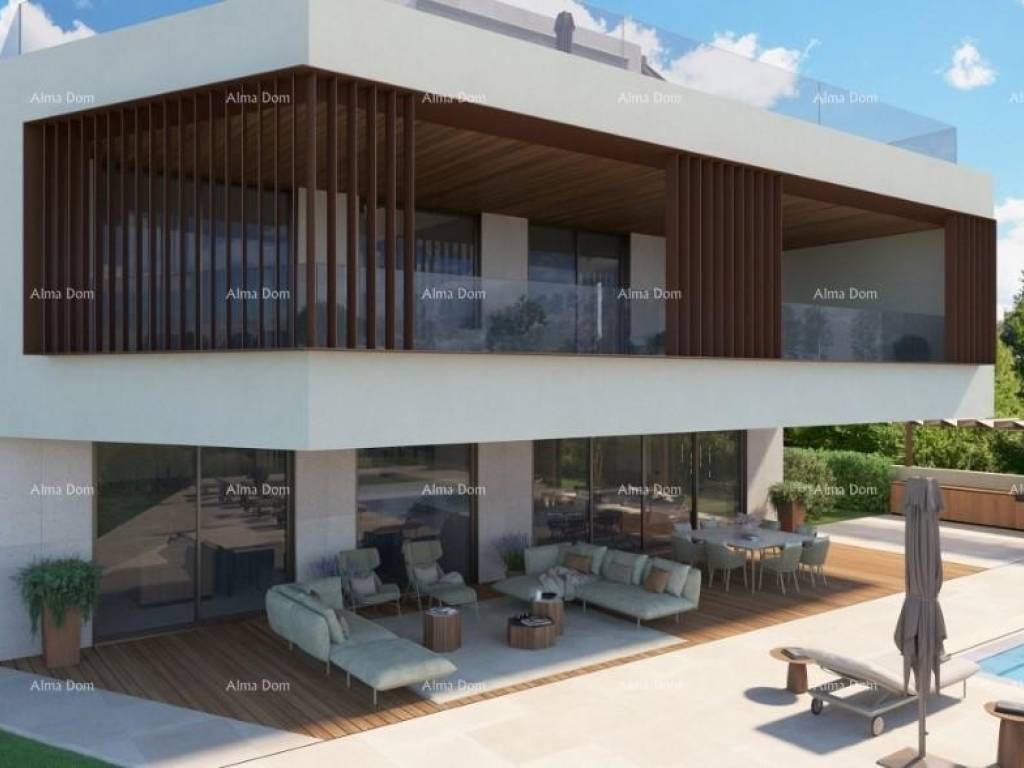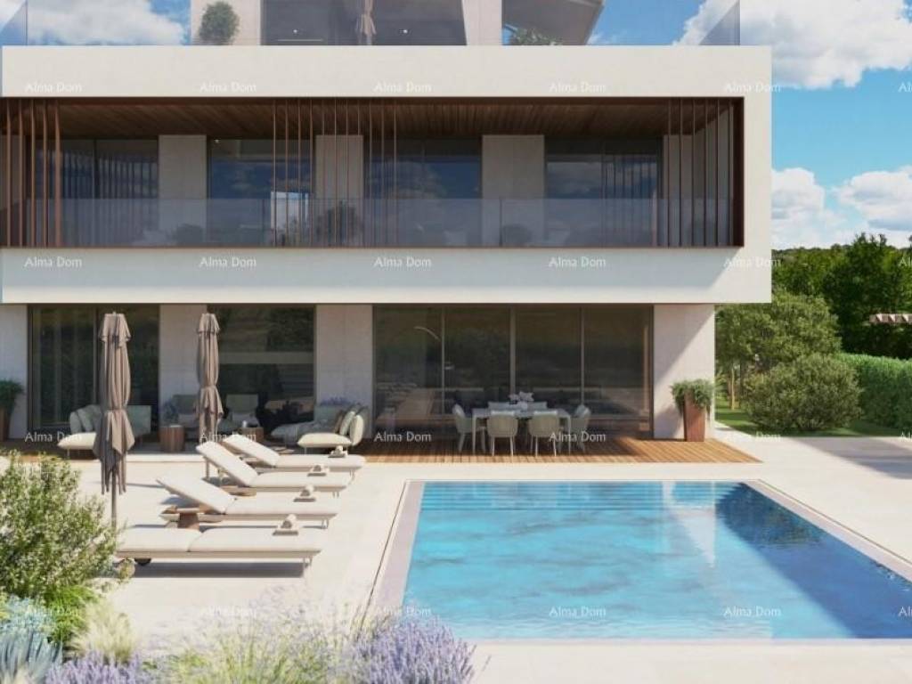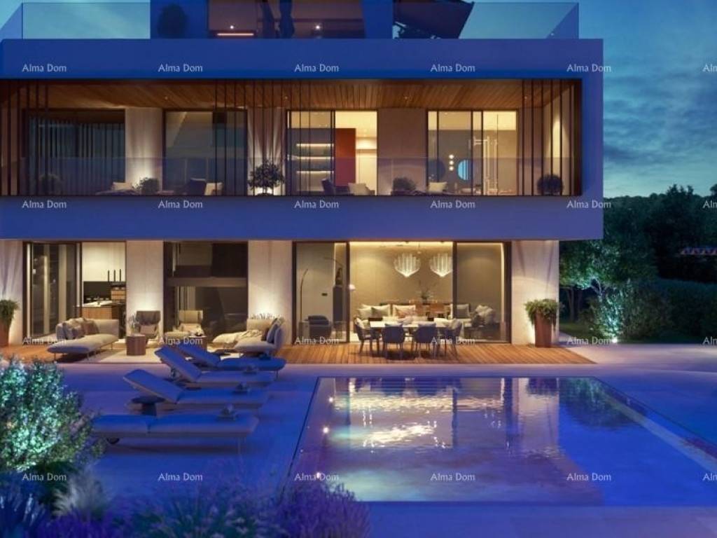 Продается современная вилла в Ровине. Вилла с лифтом, площадь 316 м2, состоит из первого этажа, второго этажа и мансарды. Он расположен на участке площадью 1180 м2 и состоит из просторной гостиной, которая соединена с большой крытой террасой, роскошной кухни Poliform, оснащенной высококачественной бытовой техникой, трех спален с отдельными ванными комнатами, гардеробными и крытыми террасами. Терраса на крыше с джакузи, сауной, эмоциональным душем, баром, туалетом и зеленым садом. Крытые террасы 164 м. Открытые террасы 105 м.