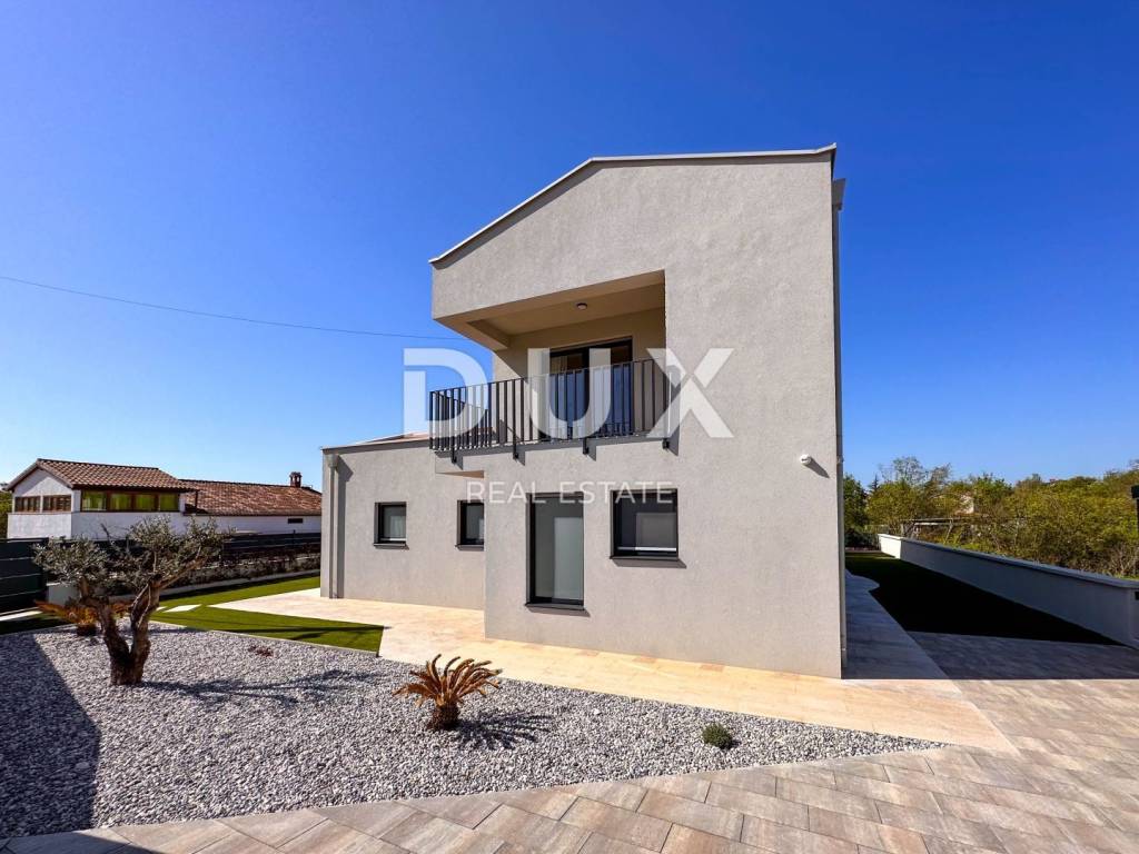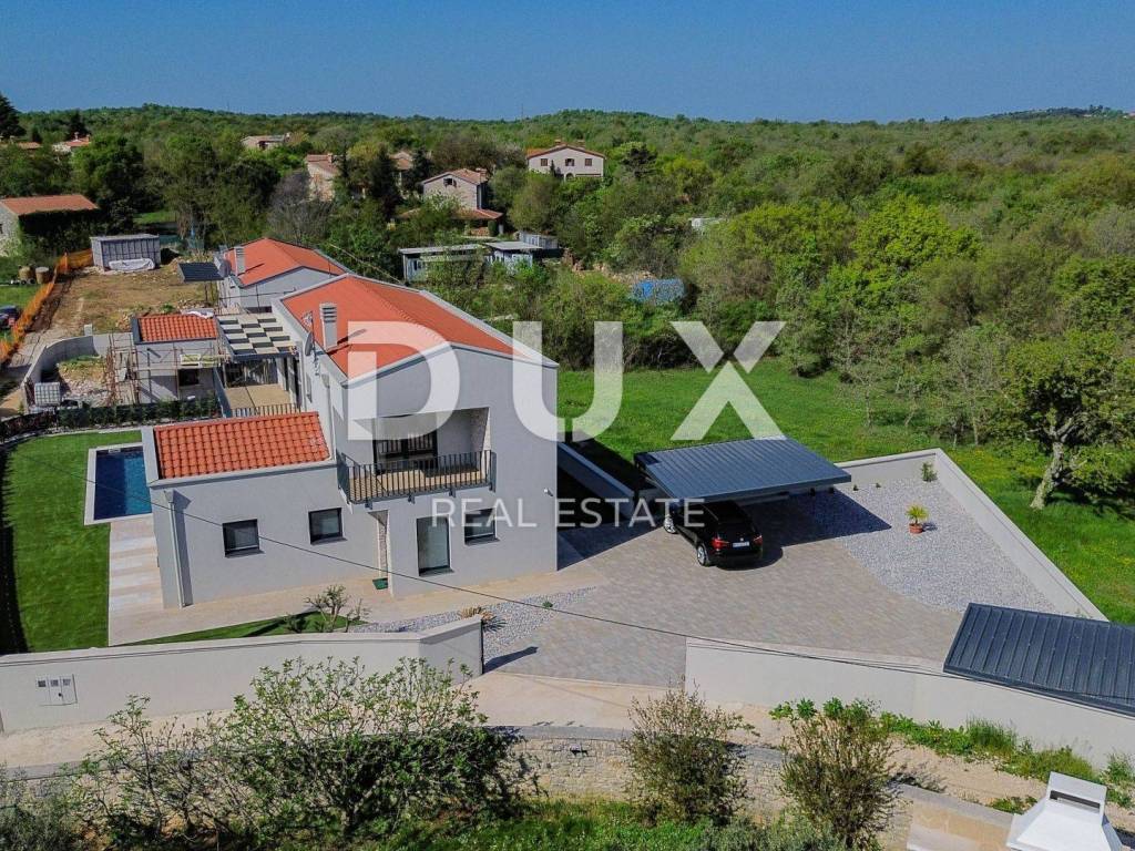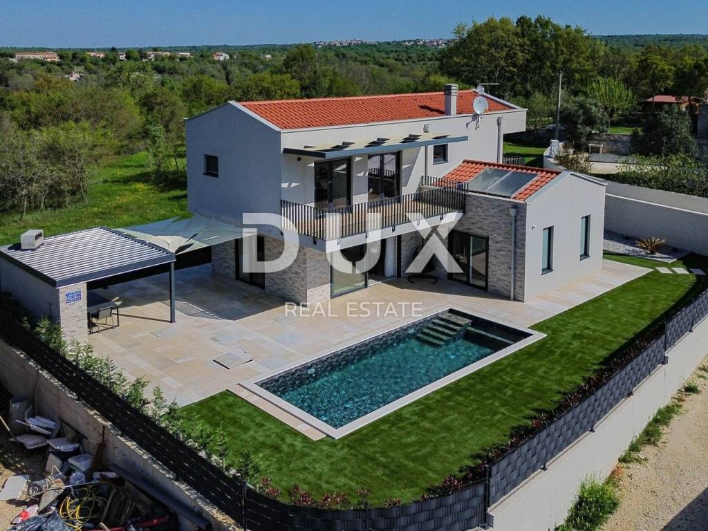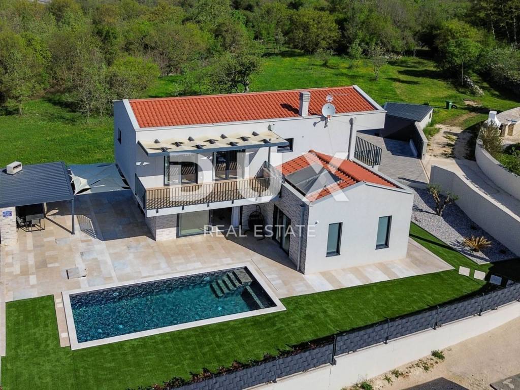 Sveti Lovreč is located in the middle of lush lavender fields in the western part of the Istrian peninsula, in the immediate hinterland of Vrsar, Poreč and Rovinj, and is one of the best preserved medieval fortified towns in Istria. The location of the small town on a gentle hill that dominates the area where as many as 22 settlements, villages and hamlets are scattered speaks of its significant role throughout history. Along the slightly indented western coast of Istria, there are several deep bays, of which the Lim Bay is partially part of the municipality of Sveti Lovreč. The Lim Bay is a natural phenomenon of great scientific and aesthetic value; it was declared a special reserve in the sea. This beautiful modern Villa represents an ideal combination of modern and Istrian style, located near Svetog Lovreč, in a quiet small village consisting of family houses and holiday homes. The villa extends over two floors. It has a total area of 198.82 m2 and is located on a plot of 792 m2. The ground floor of this villa consists of a porch, an entrance hall, a bathroom, a laundry room, a technical room, a storage room, a bedroom with a private bathroom adapted for people with disabilities, and a spacious living room with a dining room and a modern kitchen in an open space concept. From the living room there is direct access to the covered terrace and sunbathing area with a swimming pool, creating a perfect space for relaxation and enjoyment. The staircase leads to the first floor of this Villa, which consists of a hallway and three bedrooms, each with its own bathroom. All bedrooms have access to a covered balcony with beautiful views of nature. The rooms are fully equipped with quality furniture, satellite television and air conditioning, providing comfort and privacy. There is a swimming pool with internal dimensions of 9x3.5 meters in the beautiful garden. The pool has a concrete staircase, three jets near the stairs and two on the floor. It will be coated with D3 foil and the pool is prepared for heating, so all you have to do is install the pool heating device. Stones will be placed on all paths around the house, as well as on the beach by the pool. Artificial grass will be placed on one side of the pool to prevent dirt from entering the pool. The yard will be beautifully decorated with Mediterranean plants and grass will be planted on the back side of the house with an irrigation system. A metal fence will be placed around the Villa, on which a green fence will also be placed so that you have complete privacy while enjoying this Villa. There will be two entrances, one of which is an entrance via a remote-controlled electric fence. A spacious summer kitchen will be located by the pool, which will be covered on 3 sides plus blinds. The summer kitchen will have a large fireplace, gas grill and water. It will be connected to the house with sails so that you can enjoy the shade in the hot summer months. Next to the summer kitchen, there will be a children's park for the entertainment of the youngest members of the family. At the back of the Villa, there will be an object that will be anthracite black in color and will serve as a storage room for deckchairs and all other equipment. The facility will have water and electricity. Next to this building there will be a space for bicycles. There is also a parking lot that will be paved with paving stones measuring 30x60 cm. The parking lot is for two to three cars and will be covered in anthracite black. There will also be an electric charging station for your tin pets in the parking lot. The house has a bio septic tank. Video surveillance is installed around the entire Villa and there are a total of 7 cameras. The heating is via floor heating on a heat pump, which is carried through the entire house. Air conditioners and devices are installed in all rooms and are also used for heating and cooling. There is also a fireplace in the living room, so you have another heating source. Two solar panels for hot water are installed on the roof, and the boiler is 400 liters. The whole house is connected to a water purifier. This beautiful Villa has an additional advantage - from the end of the year it will be equipped with 13 electric solar panels, creating its own power plant of 7.4 kW. This will significantly reduce energy costs for future owners. The price includes high-quality custom-made furniture. Attention was also paid to indoor and outdoor lighting, which can be regulated. Mosquito nets are installed throughout the house, except for the large glass walls. Electric blinds are installed on the windows. The outer insulation is 10 cm, and the floor is 13 cm. The carpentry is made of PVC. The villa is finished and all that remains is to arrange the garden, swimming pool and outdoor facilities. By the end of 2023, the Villa will be completely finished, including landscaping of the garden, swimming pool and outdoor facilities. In about fifteen minutes you can already be in Poreč, Vrsar and on the well-maintained beaches. The first shops, restaurants and other facilities are located in Sveti Lovreč and you can be there in just a few minutes. This villa represents an excellent opportunity for family life, a luxurious vacation from the stress of city life in the Mediterranean climate or as a financial investment for rental.