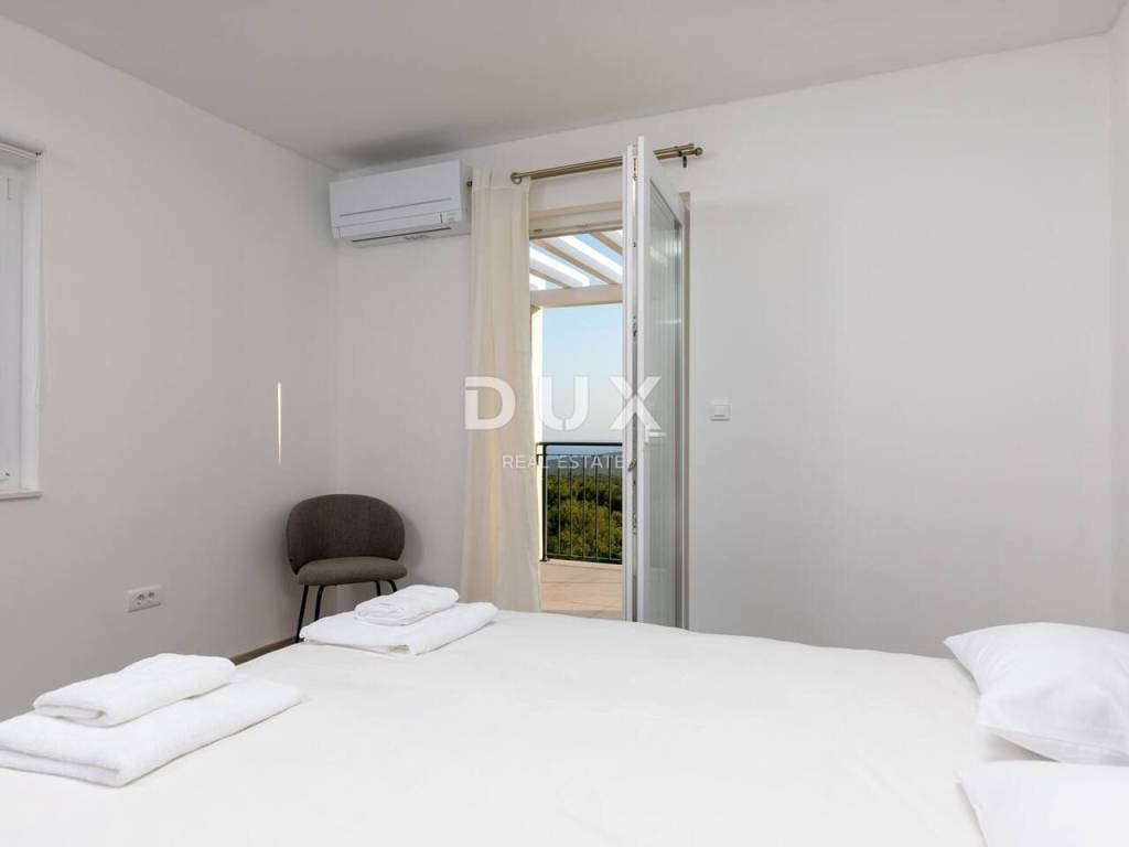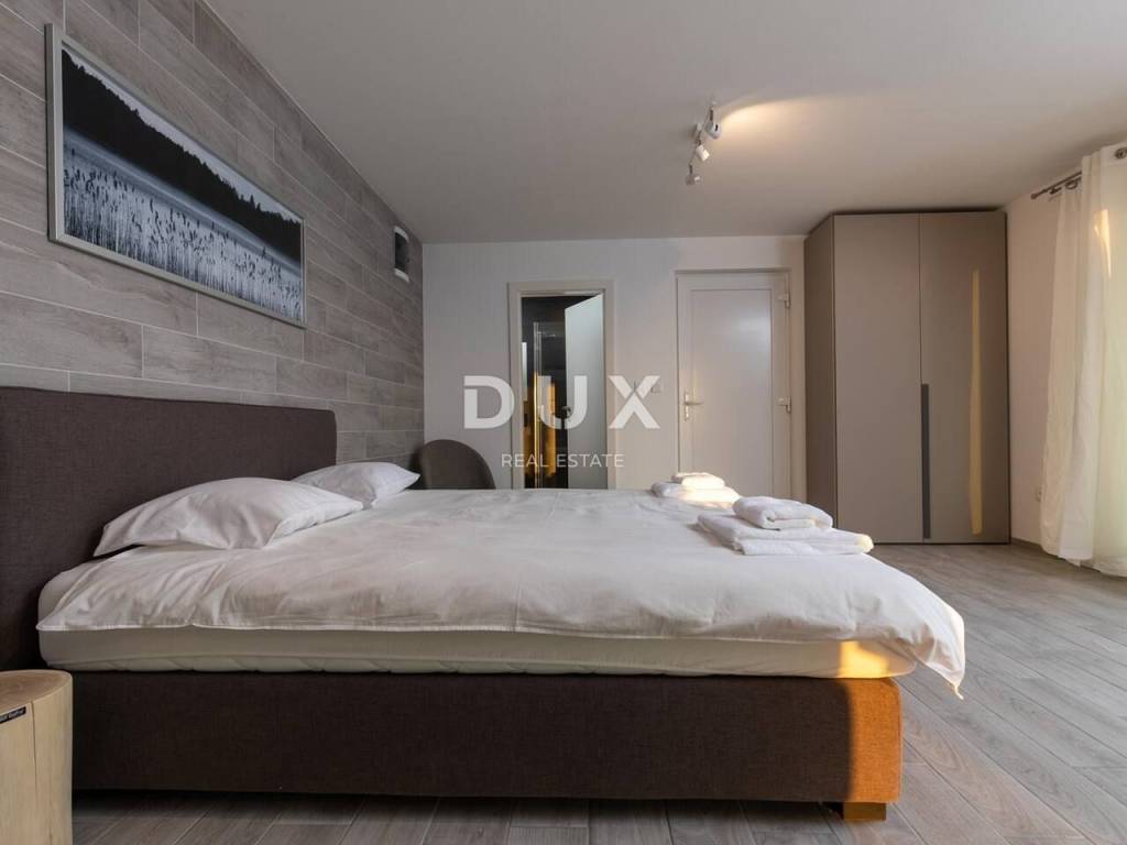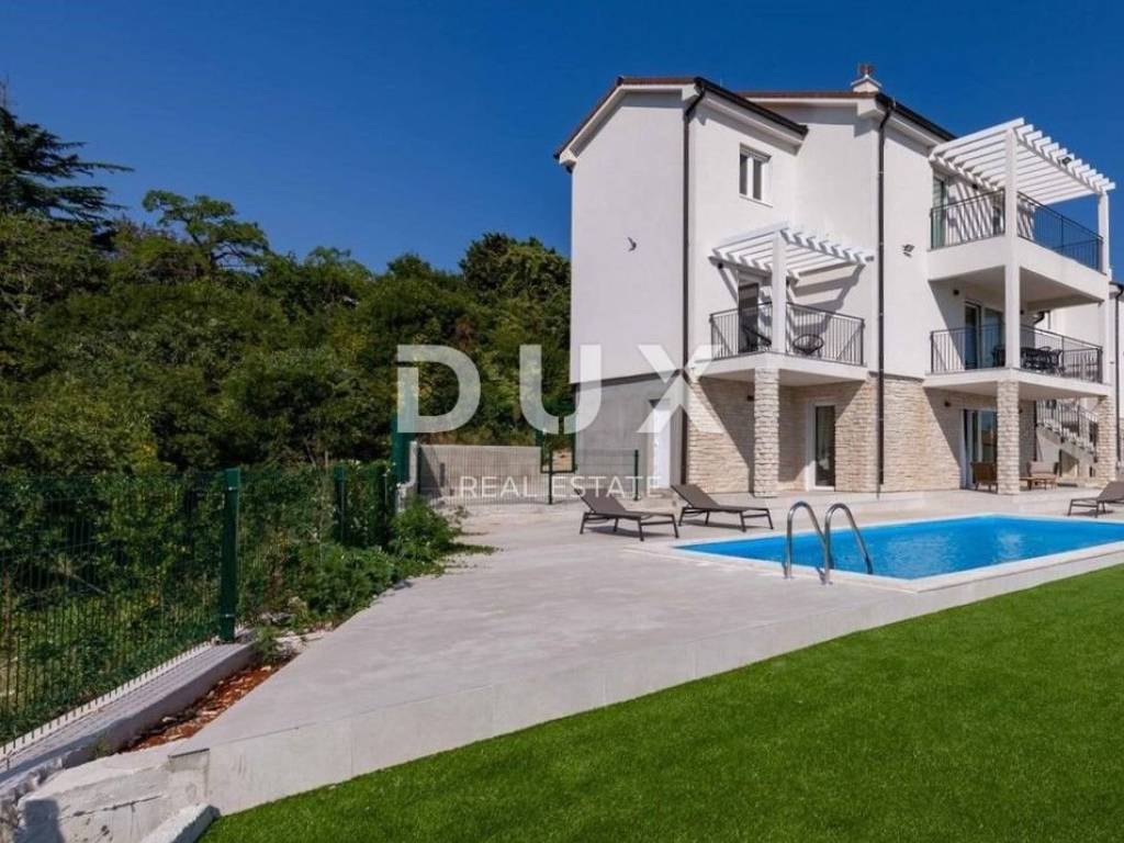 Not far from Rabac in a small village by the sea, a villa with panoramic sea views is for sale. The villa has a total area of 180m2 and consists of ground floor and 2 floors. On the ground floor there is a studio apartment with access to the terrace. Upstairs is a duplex apartment with separate entrance. On the first floor there is an open-space living room with dining area and a fully equipped kitchen with balcony, a guest toilet and a bedroom with bathroom and balcony. On the second floor there are 3 bedrooms, a bathroom and one balcony. The villa is equipped with air conditioning. On the fenced and landscaped garden there is a swimming pool with sun deck, barbecue and 2 parking spaces. This is the perfect place for rest and relaxation or family life. OPPORTUNITY!!!