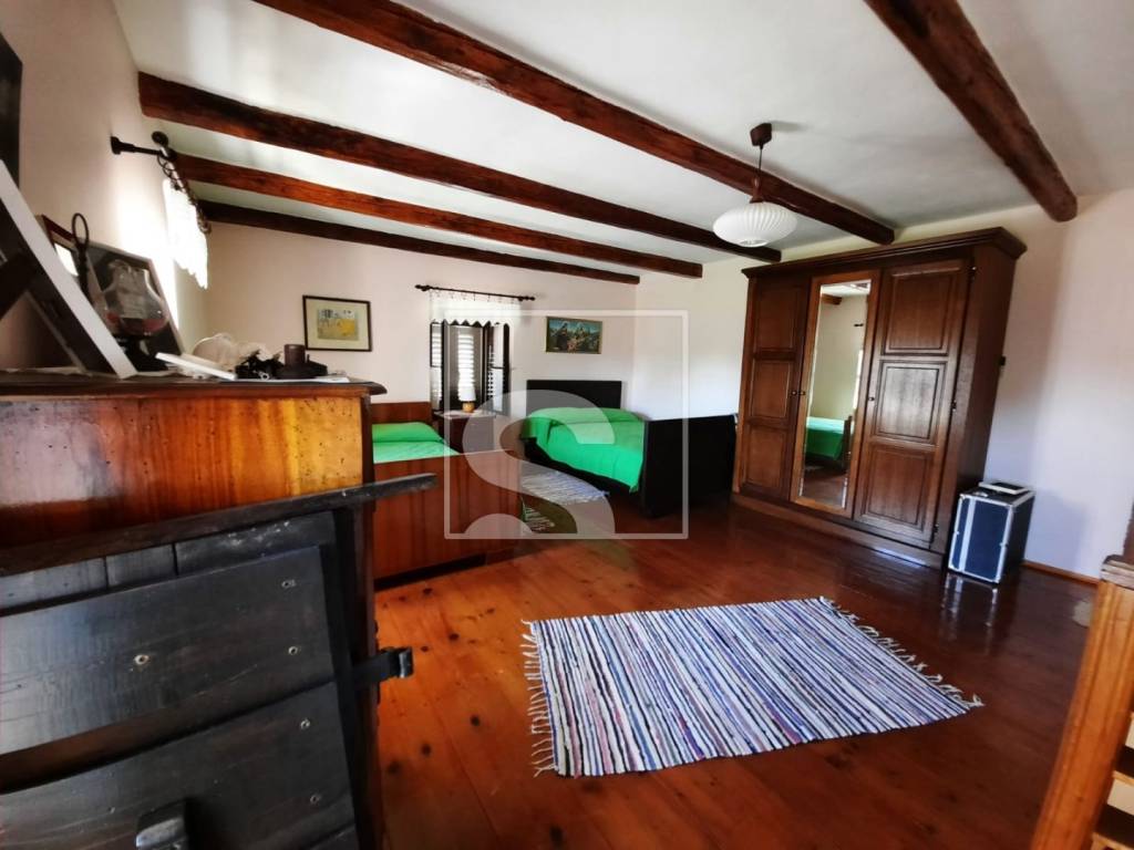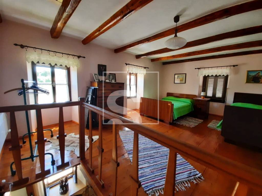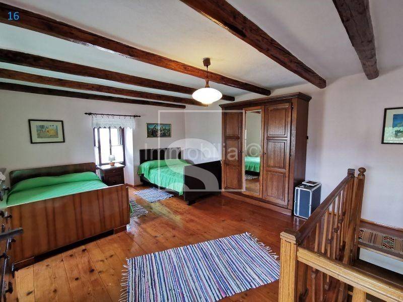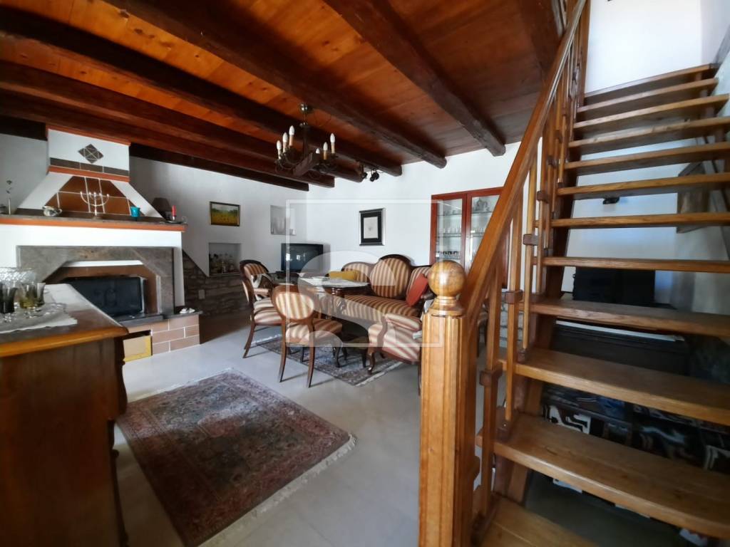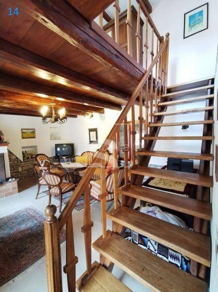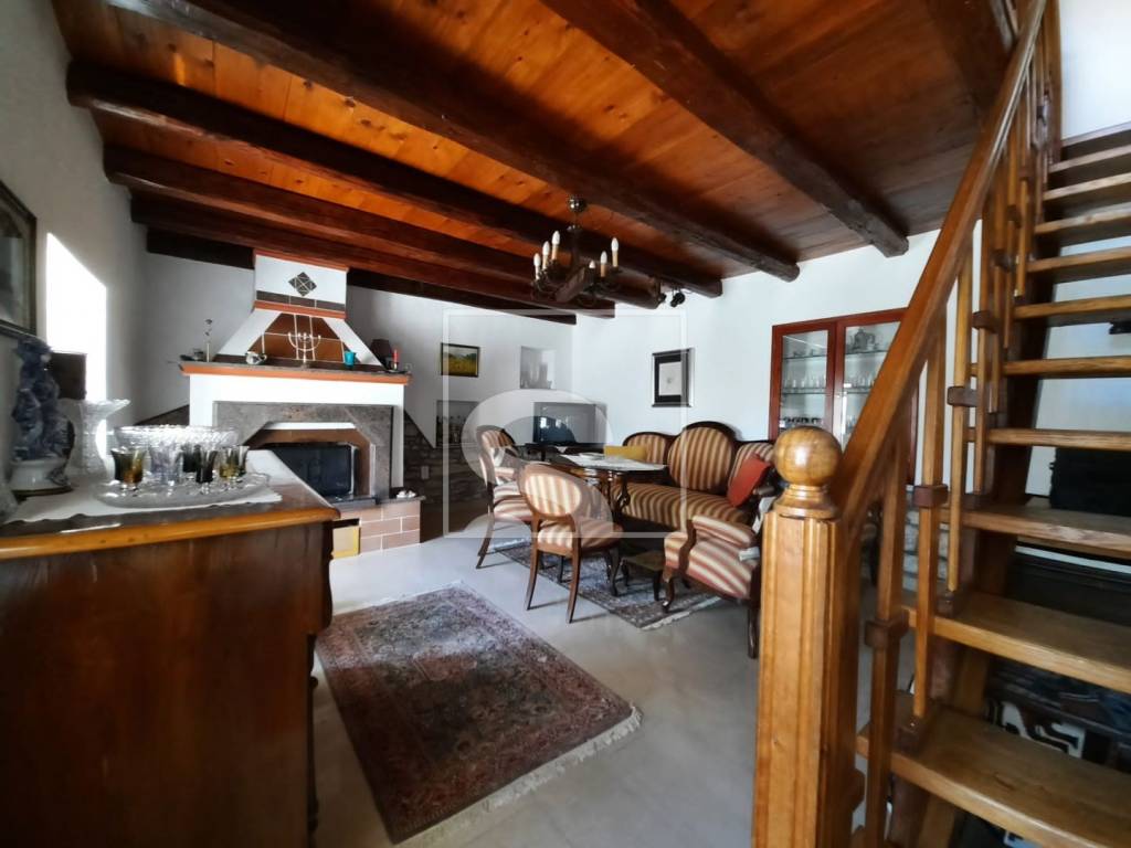 The property is organized into two separate units, allowing for multi-family living or a combination of residence and rental. The first unit consists of an entrance hallway, a separate living room with a fireplace, and a gallery space accessed by wooden stairs, where a spacious bedroom is located. On the ground floor, there is also a kitchen, one additional bedroom, and a bathroom. This unit has access to a paved terrace overlooking the garden, while on the opposite side there is direct access to a 38 m² garage.