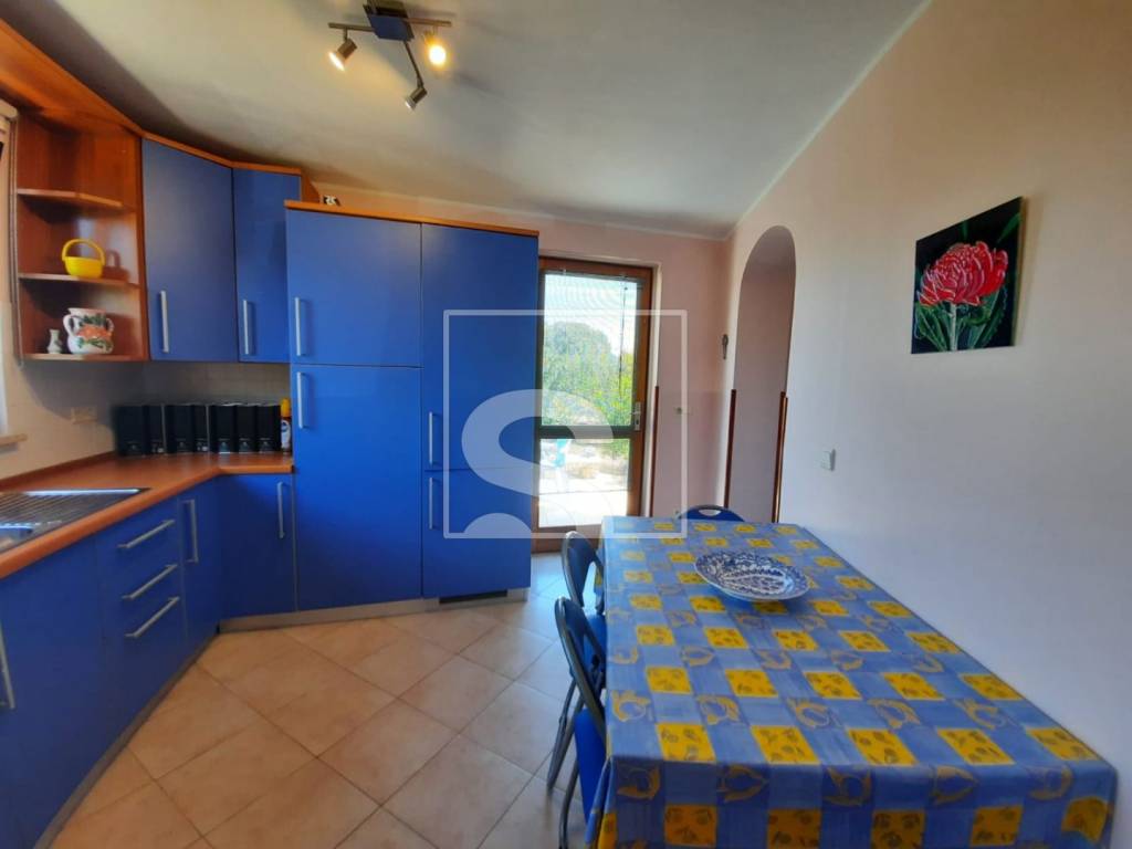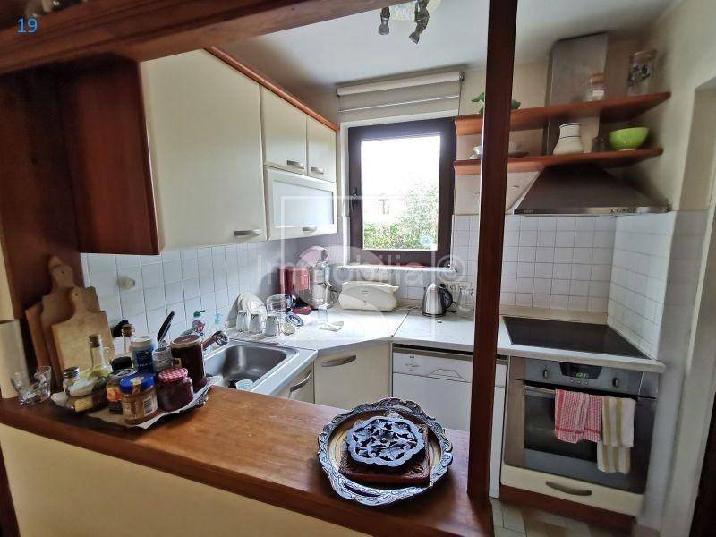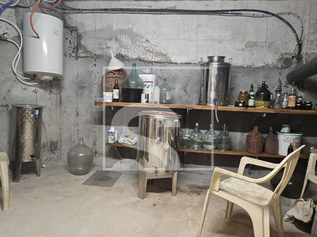 The second residential unit has a separate entrance and includes a kitchen, living room, one bedroom, and a bathroom. This part of the house is connected to a large basement used for storing wine and olive oil. It also includes two parking spaces and a private garden with a sea view.