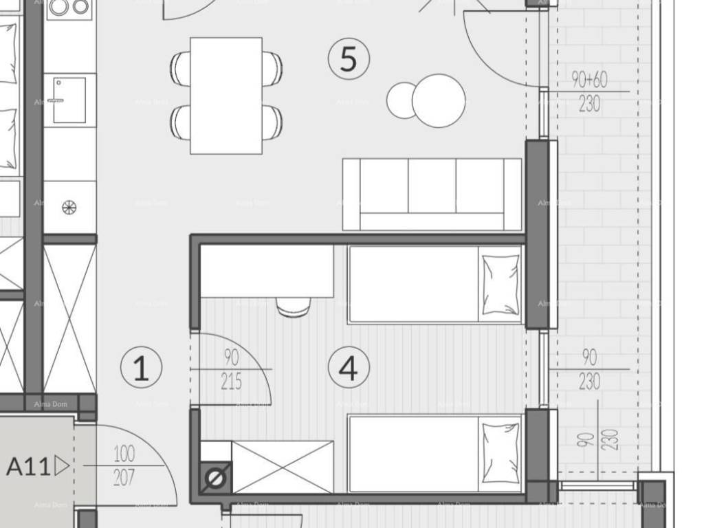 Квартира A11 находится на 2-м этаже здания и состоит из: прихожей + гардеробной, гостиной с кухней и столовой, 2 спален, ванной комнаты и крытой террасы. К квартире принадлежит одно парковочное место PM4 площадью 3,12 м2. Квартиры будут оснащены инверторными кондиционерами, теплым полом в ванных комнатах, качественной керамикой и полами.