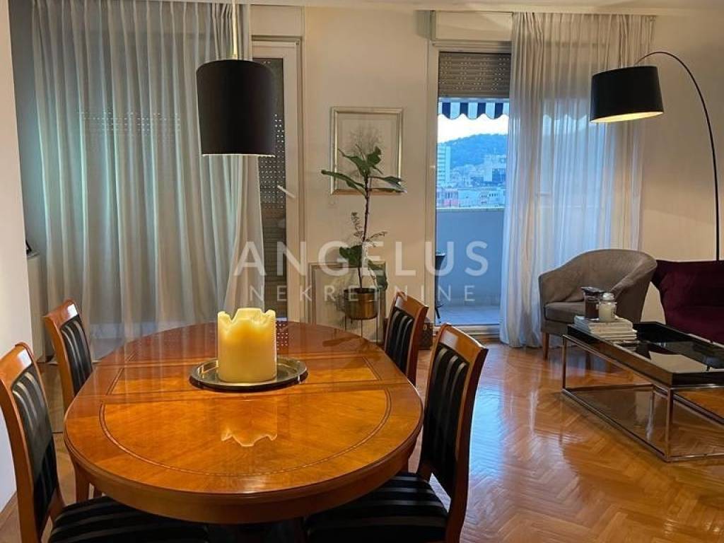 This beautiful and spacious apartment with a total area of 80 m2 is located on the fifth floor of a newer building. The apartment consists of a living room, a kitchen with a dining room, two bedrooms, one bathroom, an additional toilet, a hallway and a loggia. The living room leads to a terrace with a beautiful view of the city, which gives this property a special charm. The apartment is extremely bright and airy, oriented north-south, which allows for plenty of natural light throughout the day. It is being sold fully furnished and equipped with all necessary appliances, ready to move in without additional investment. The apartment also includes one parking space in a closed basement garage of 17 m2.