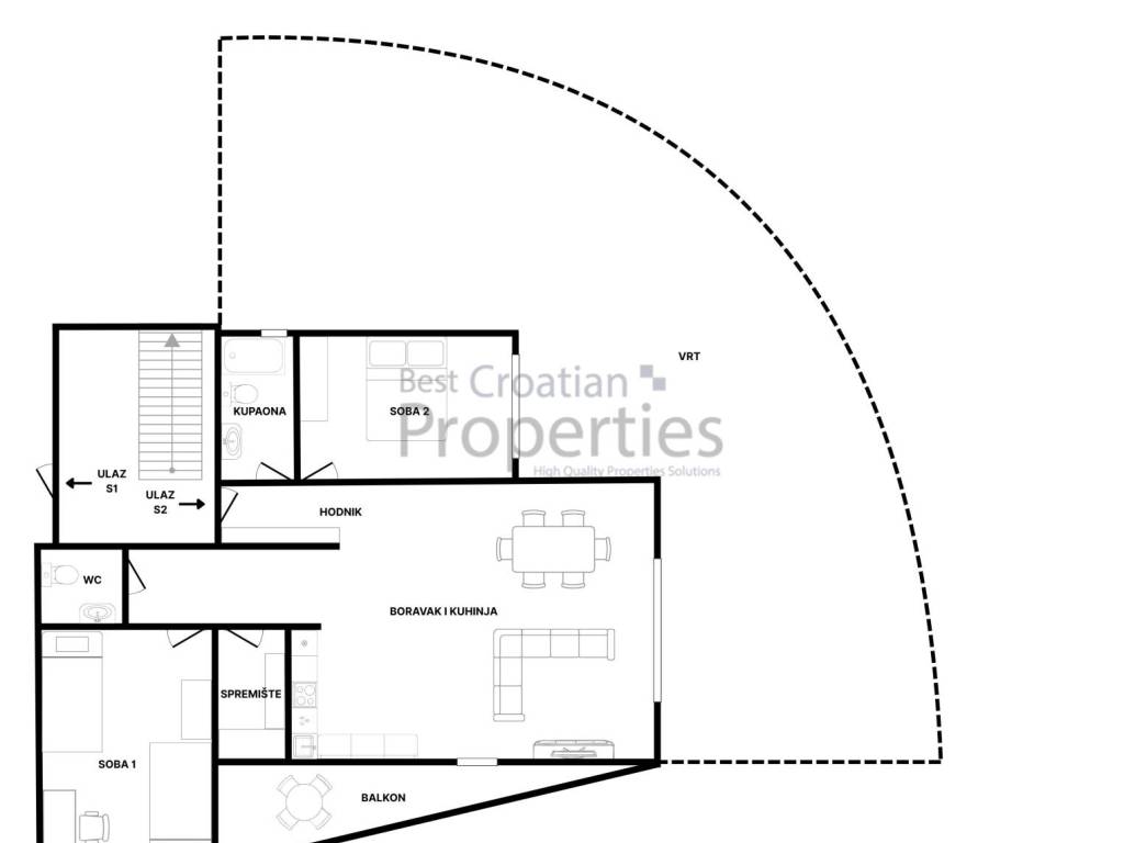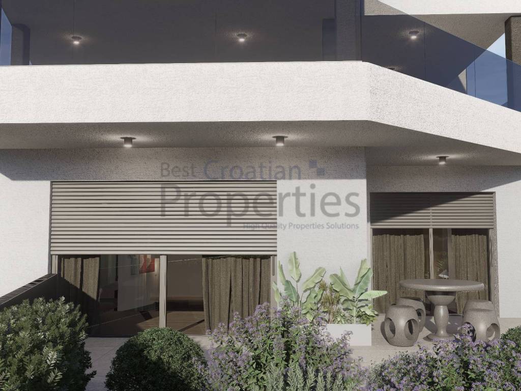 Stan je neto korisne površine 102,35m2 na prvom katu urbane vile od 3 stana (ukupno 2 kata) i sastoji se od prostranog dnevnog boravka s kuhinjom i blagovaonom, dvije spavaće sobe, kupaonice, WC-a, privatnog vrta orijentacije sjever-istok te natkrivenog balkona.