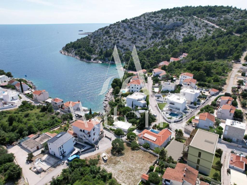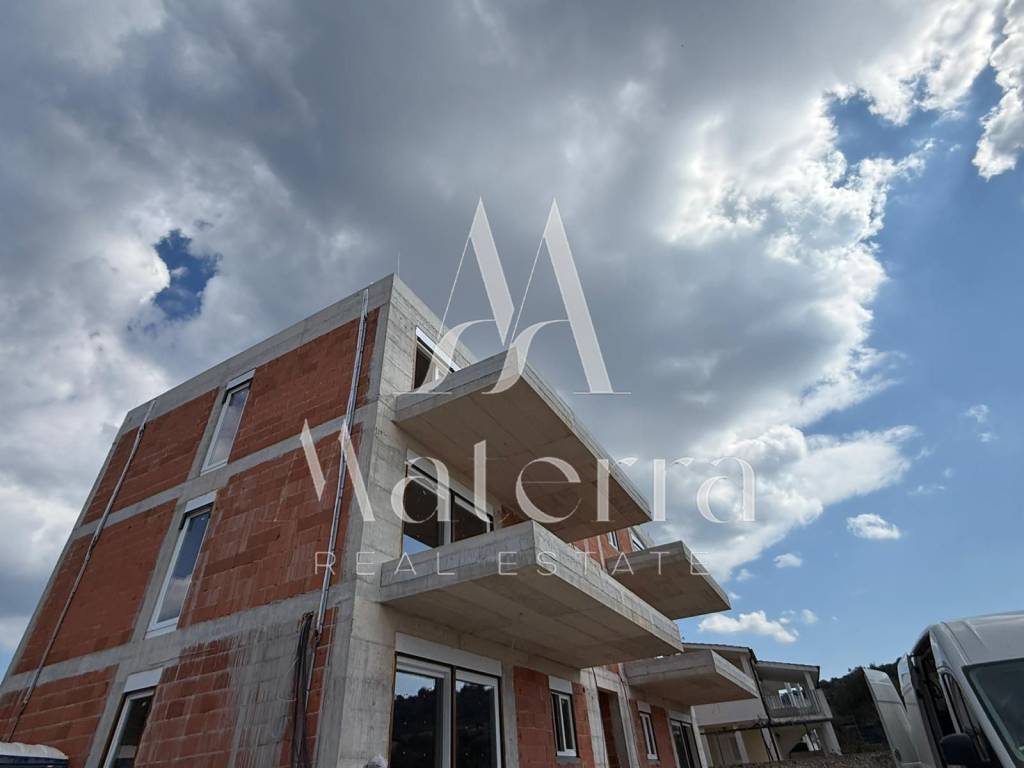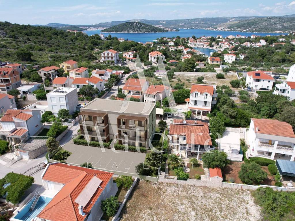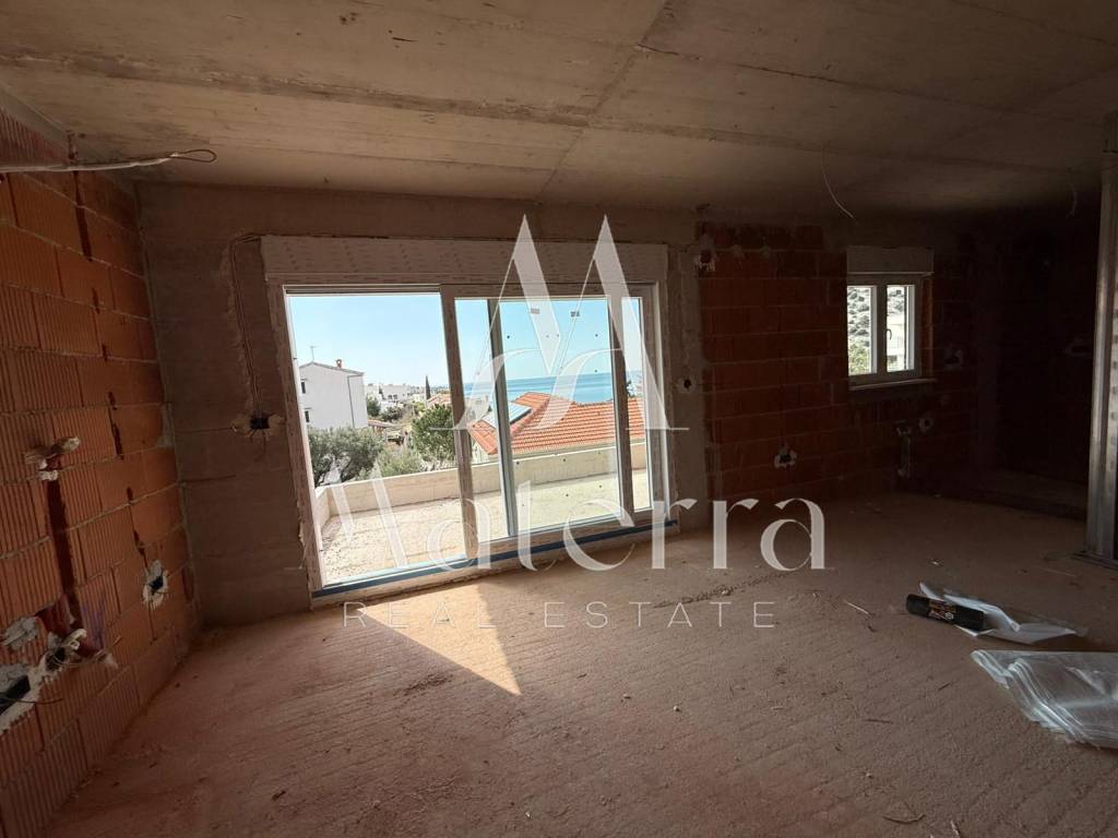 A luxurious two-bedroom apartment with a sea view is for sale, located in Stivašnica bay, near Rogoznica. The apartment is situated on the first floor of a modern new building and has a total usable area of 77.81 m².