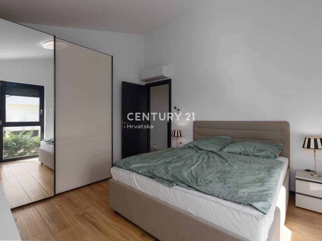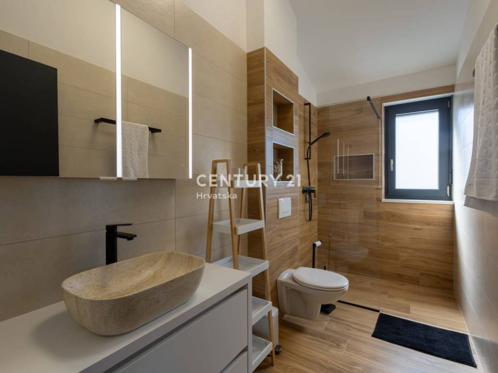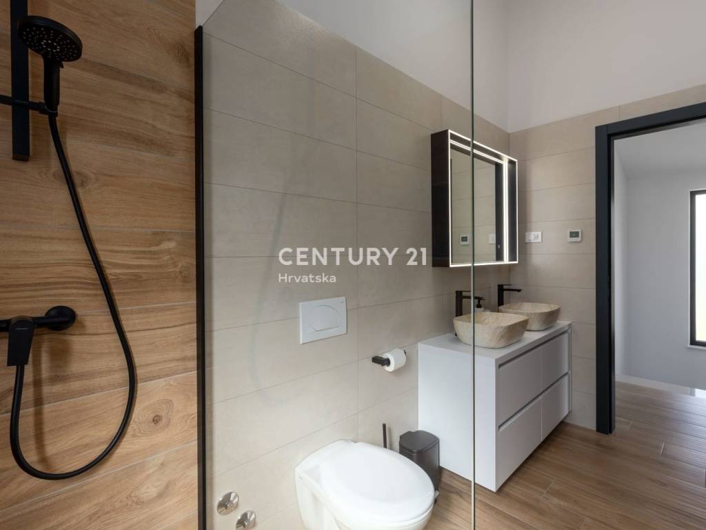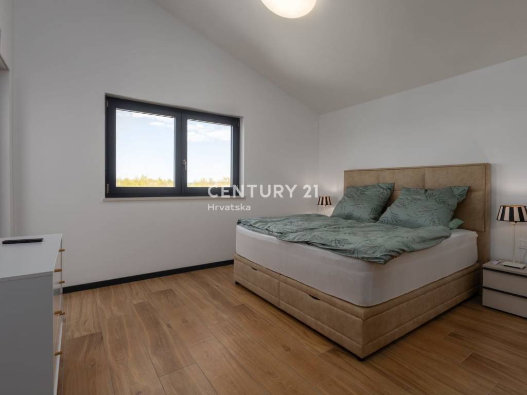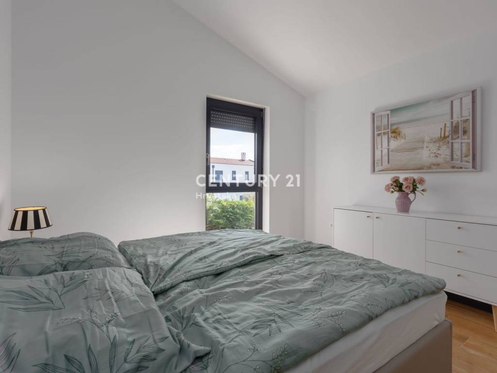 Izgrađena po visokim standardima, kuća uključuje podno grijanje putem toplinske pumpe i inverterske klima uređaje u svim sobama, što osigurava udobnost tijekom cijele godine.