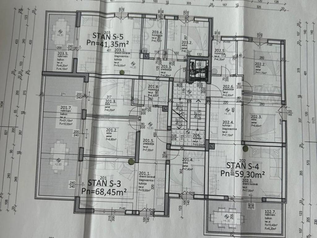 Sastoji se od: dvije spavaće sobe, dnevnog boravka + kuhinja + blagovaona, predsoblja, kupaonice i terase.