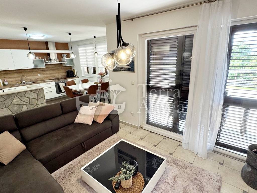 The apartment with a total living area of ​​72 m2 consists of a hallway, a spacious living room connected to the kitchen and dining room in an open space concept, two comfortable bedrooms, a practical storage room and a modern bathroom. The living room leads to a covered terrace that leads to a spacious, beautifully landscaped garden with an open view of the sea - an ideal space for rest, relaxation and socializing outdoors.