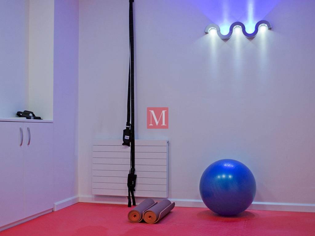 Fitness room floor is covered with sport surface.
