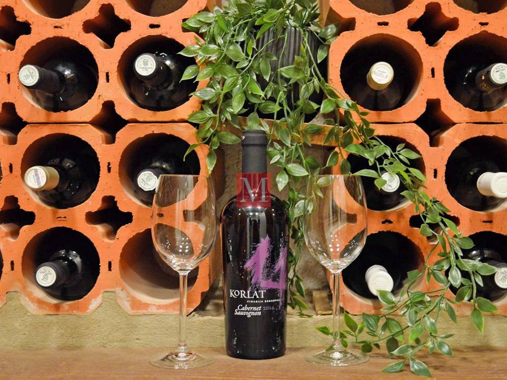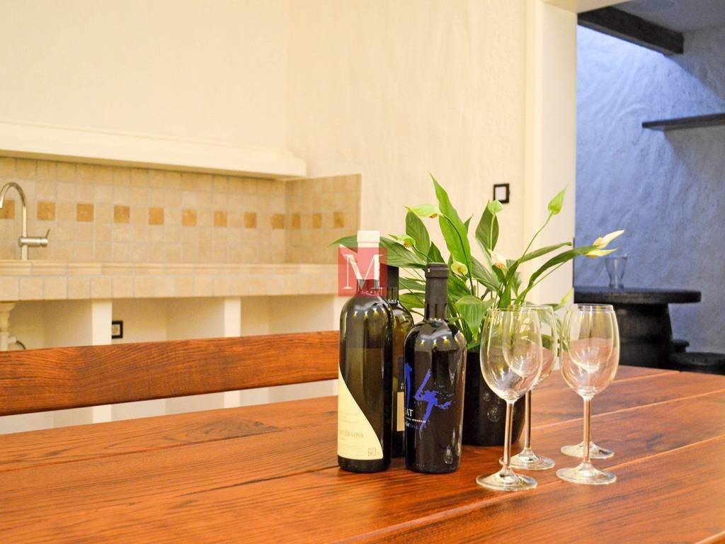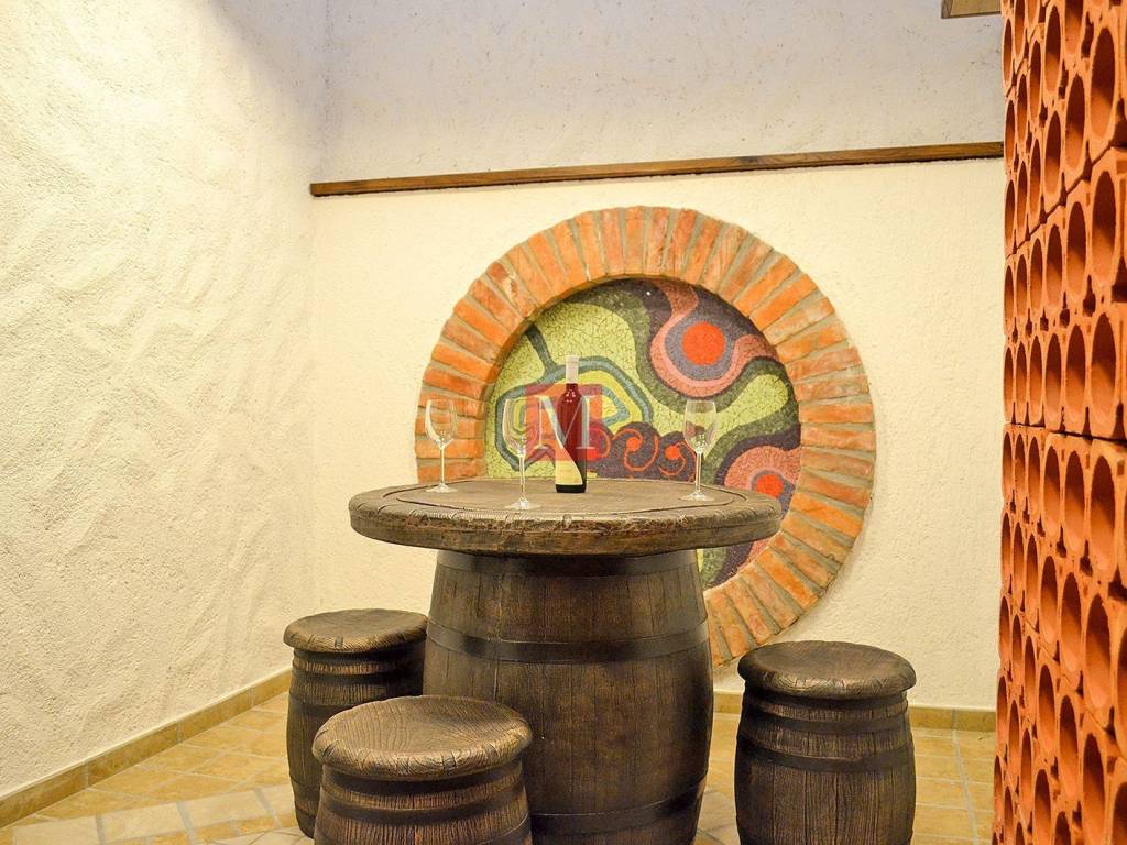 In wine cellar rustic hand plaster has been made, old bricks were set on the walls and clay elements for bottles of wine
