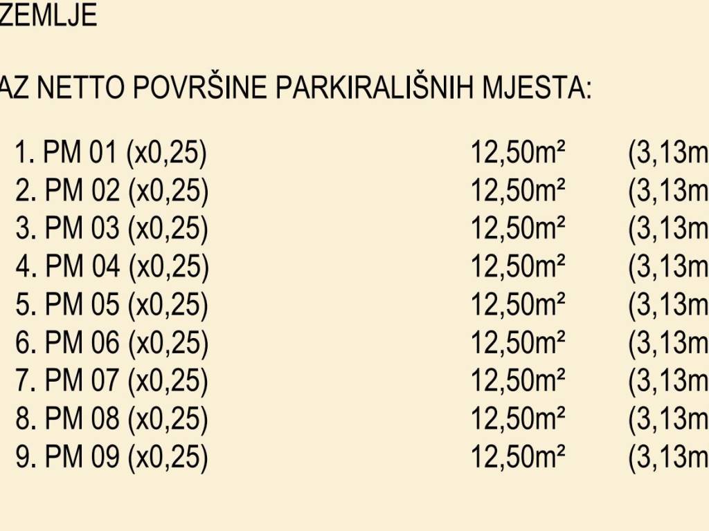 - površina pojedinog mjesta: 12,50 m² (obračunski 3,13 m²)