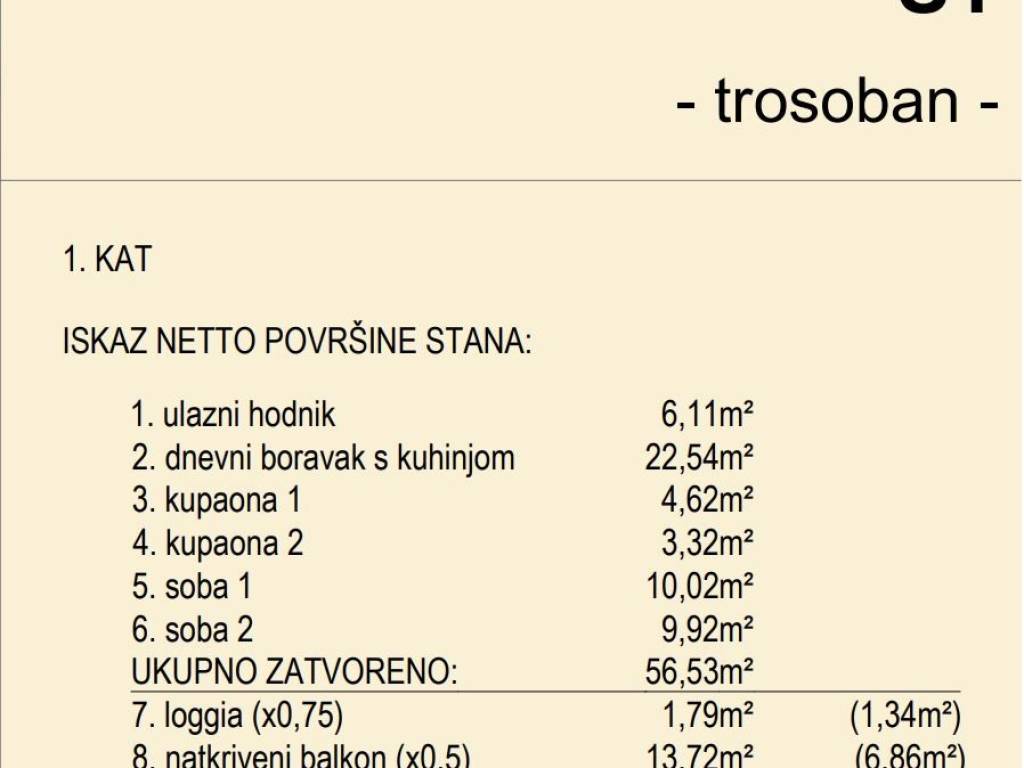 Prodaje se trosobni stan s pogledom na more ukupne neto površine od 64,73m2 u mirnom i atraktivnom dijelu Novalje, Mlaji (Babe), u sklopu novog projekta moderne stambene građevine s funkcionalno projektiranim trosobnim stanovima.