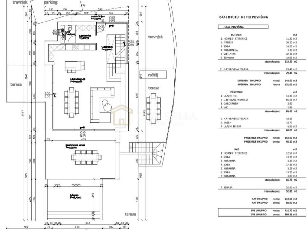 CASA BELLA iz ponude izdvaja građevinsko zemljište u Ičićima, 900m zračne linije od mora, sa građevinskom dozvolom i gotovim projektom za modernu kuću. Teren ima ishodovane dozvole, kao i plaćene komunalije struje i vode, prilazni put, te se s gradnjom može započeti odmah. Prema projektu, kuća ima 416,70m2, te se sastoji od suterena, prizemlja i prvog kata.