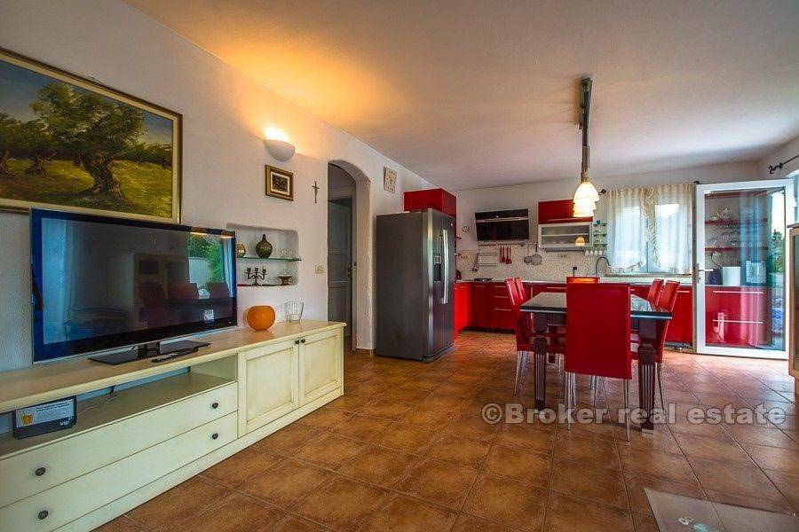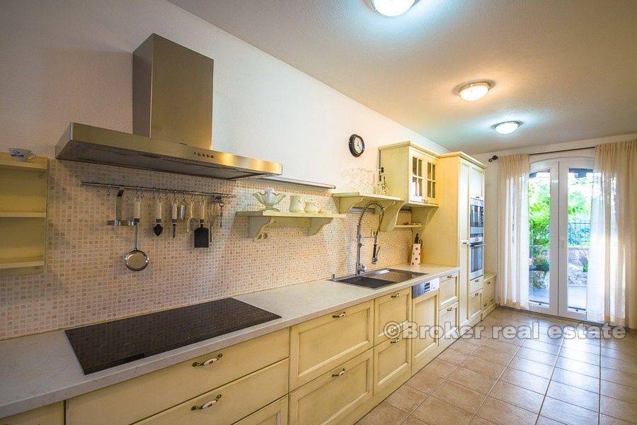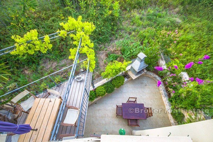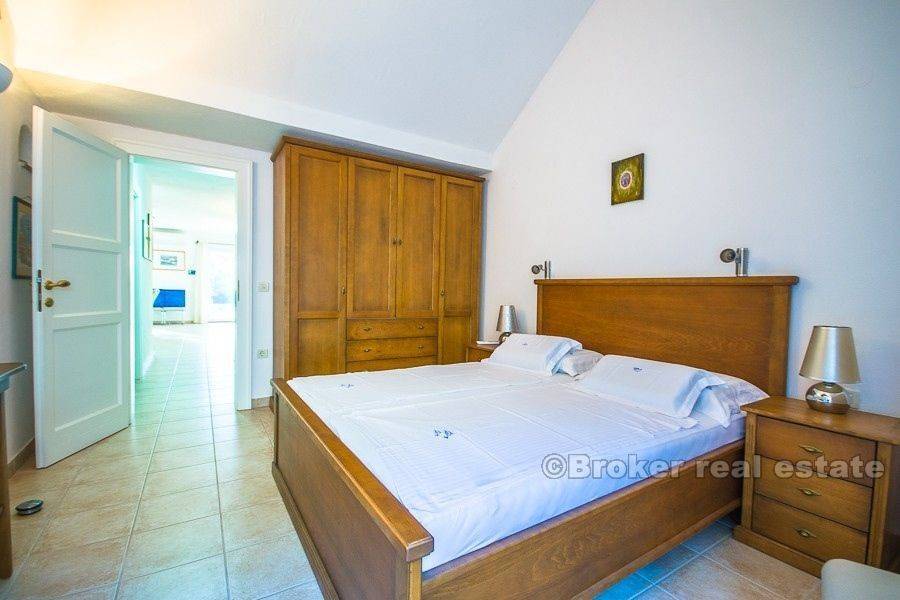 For sale is a fully equipped stone villa, located in a smaller place on the island of Brac. The villa is spread over a total of 300 m2 of living space and consists of ground floor, first and second floor and attic. The property also has three belonging terraces with partial sea views. On the ground floor of the property there are two bedrooms, bathroom, comfortable living room with kitchen and dining room. At this level there are two terraces (south and east, approx. 40 m2) as well as a sauna, pantry, wine cellar, and a swimming pool with a solar water heater capacity of 300 liters. On the first floor there is a large living room with kitchen, dining room, toilet and stairs leading to the second floor. Although the ground floor and first floor are connected by an internal staircase, they are separated by a door and can be used as two separate suites. From this floor is an exit to the terrace with an outdoor heated pool and a sunbathing area. The second floor consists of two comfortable bedrooms with their own bathrooms, while on the top attic is a workroom. The property is air-conditioned, central heating is installed. The current owner of the property has paid attention to details, all furniture is custom made, and all used equipment has a high quality. Although the property is located near the town center, a large stone enclosure surrounding the property (with video intercom) provides a great amount of privacy to the real estate users. The property is located in a small place near the town of Supetar, where are all the necessary facilities – cafes and restaurants, as well as a ferry to Split