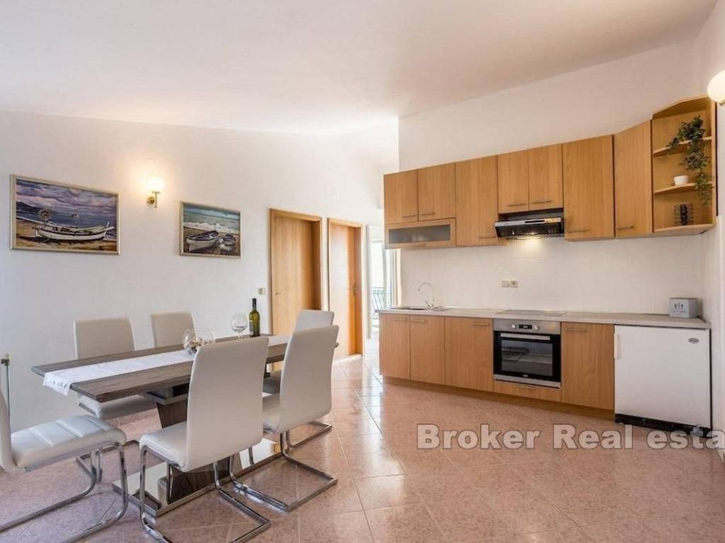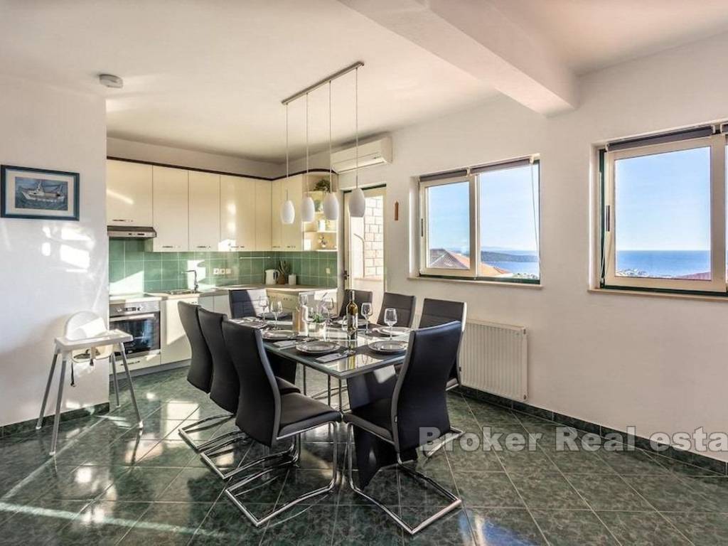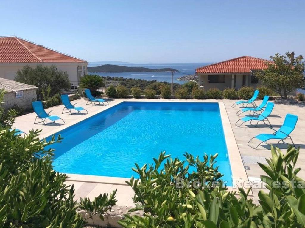 House on 3 floors with swimming pool and restaurant. It has a wonderful panoramic view on sea. Land area is 3600 m2 and 600 m2 of living space. On the ground floor is restaurant. On the first floor are 4 bedrooms with 2 bathrooms and living room. The second floor has 2 apartments. The pool is 12×6 meters on the property is located 80 olive trees and 60 fruit trees.