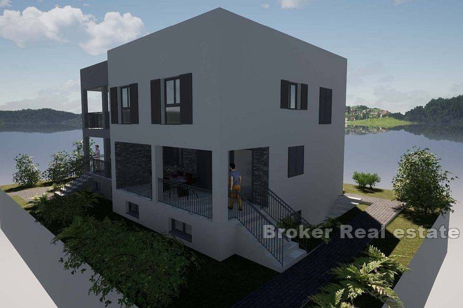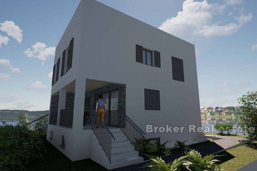 House in roh bau condition on the north side of the island of Čiovo, just a few minutes away from the center of the town. The house is located on a plot of 824 m² and extends over three floors. It has a north orientation and is sold with a conceptual project. In the basement of the house there are auxiliary rooms, while above it there are two more floors with a total of two residential units. According to the conceptual project, a one bedroom apartment with a bathroom and an open living area with access to the terrace is planned on the ground floor, while the second part has a storage room. On the first floor, a three bedroom apartment can be built with a bathroom, toilet, storage room, utility room and an open living area with access to a spacious terrace. There is enough space for parking spaces in front of the building. The building needs to be rehabilitated and completed into meaningful units. It is a good investment for tourism due to the proximity of all the facilities attractive to tourists.