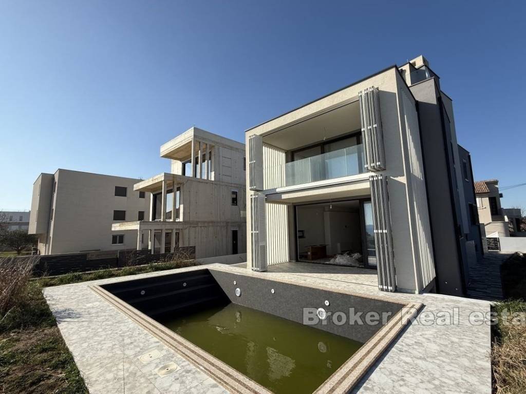 Discover a luxurious newly built villa with stunning sea views, located in a quiet cul-de-sac with a private entrance, ensuring complete privacy and tranquility. The beautifully landscaped grounds feature private parking, horticulture and a swimming pool – perfect for relaxing and entertaining. The villa includes a basement with a wine cellar, storage and an internal staircase connecting all floors. An elegant lift at the heart of the villa allows for seamless access to all levels, making the property accessible and adding to its luxurious appeal. The ground floor boasts an open plan layout with a kitchen, dining room and spacious living room. The kitchen opens onto a north-facing terrace, while the living room provides direct access to the pool and sun deck with uninterrupted sea views, just steps from the shore. Additional amenities include a laundry room, bathroom and hallway. Upstairs on the first floor there are four bedrooms – two with en suite bathrooms and direct access to the terrace with sea views. The north bedroom also has a private balcony. The loft offers a partially covered terrace equipped with a barbecue and a sundeck, ideal for entertaining and enjoying the panoramic sea views. This exceptional property stands out on the market, not only for its top-notch amenities and impeccable design, but also for its highly sought-after location close to the sea and essential amenities. The perfect blend of luxury, privacy and comfort.