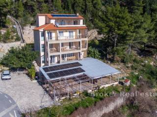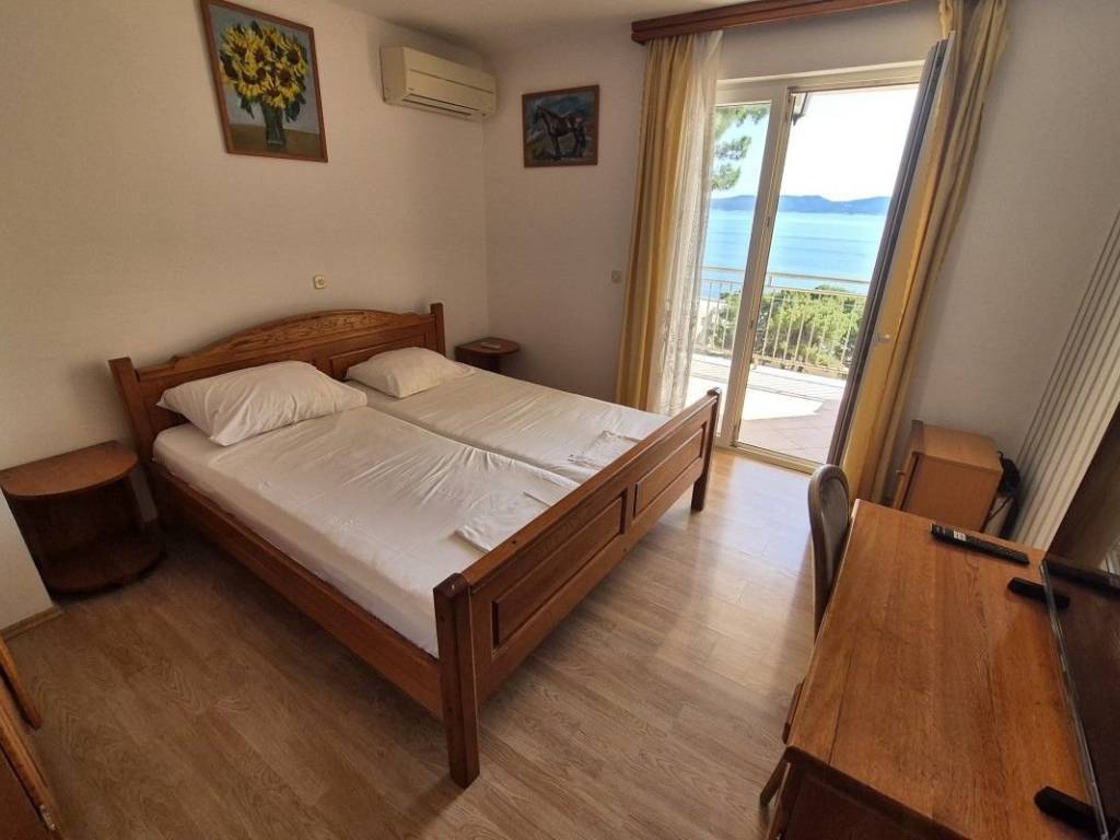 This spacious, detached guesthouse-style property with 20 rooms, a restaurant, and an open sea view is located on the western part of the Makarska Riviera. The living total area of the house is 700 m², positioned on a 1200 m² plot of land. The house consists of five floors in total. On the ground floor, there is a restaurant with a large outdoor terrace. The first floor features a three-bedroom apartment of 100 m² and a separate room with a bathroom, without a balcony. The second floor has six rooms, the third floor has an additional six rooms, while the top floor offers four rooms. All rooms have a private bathroom and a balcony. All rooms are single, except for two that are double rooms. From every floor, there is an exceptional open sea view that cannot be blocked. Behind the house, there is a spacious parking area for about 20 cars, with additional parking nearby. The property is only 150 meters away from the sea and a beautiful pebble beach. It is located in one of the most attractive parts of the Adriatic coast, a highly sought-after area among tourists, making it an excellent choice for a business investment. Along with the spacious living area, numerous accommodation capacities, and a well-established restaurant, the property has excellent tourist potential, which any prospective buyer will easily recognize.