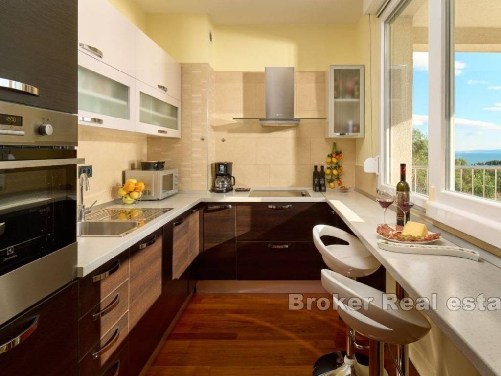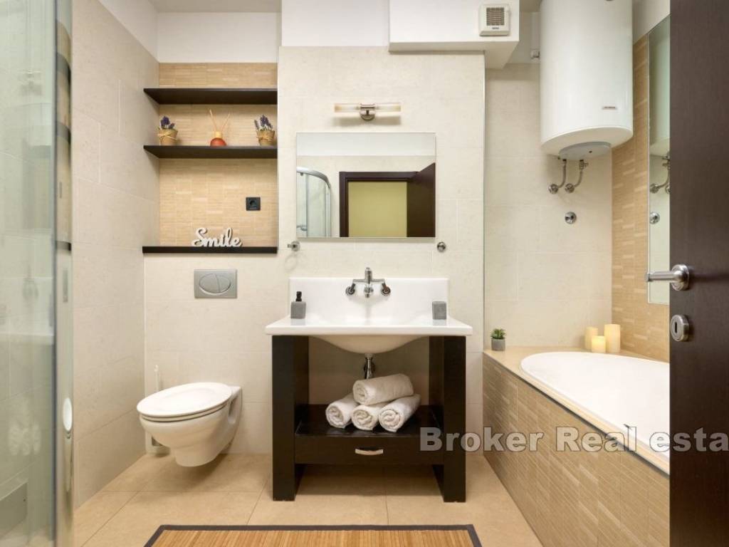 This exceptional three-bedroom apartment is located on the first floor of a small residential building. It is a perfect choice for a family, but also as an investment for tourist purposes, thanks to its attractive location. The apartment covers 101.10 m² of living space and offers a functional layout. It consists of a spacious entrance hall, kitchen with dining room, comfortable living room, three bedrooms, bathroom and separate toilet. Additional space is provided by a loggia of 8.82 m² with an open sea view, which is ideal for enjoying the outdoors. The apartment is fully furnished and equipped with modern and high-quality furniture, and is sold as is. The north-south-east orientation of the apartment allows natural light throughout the day, creating a pleasant atmosphere in all rooms. In the basement of the building there is a storage room of 6.30 m², and the garage of 18.17 m² gives this property an additional advantage, ensuring enough space for parking and storage. The excellent location of this apartment ensures easy access to all city amenities, while at the same time providing peace and privacy. The proximity to the beaches makes it a perfect choice for sea lovers, and its versatility as a tourist property makes it an exceptional investment move