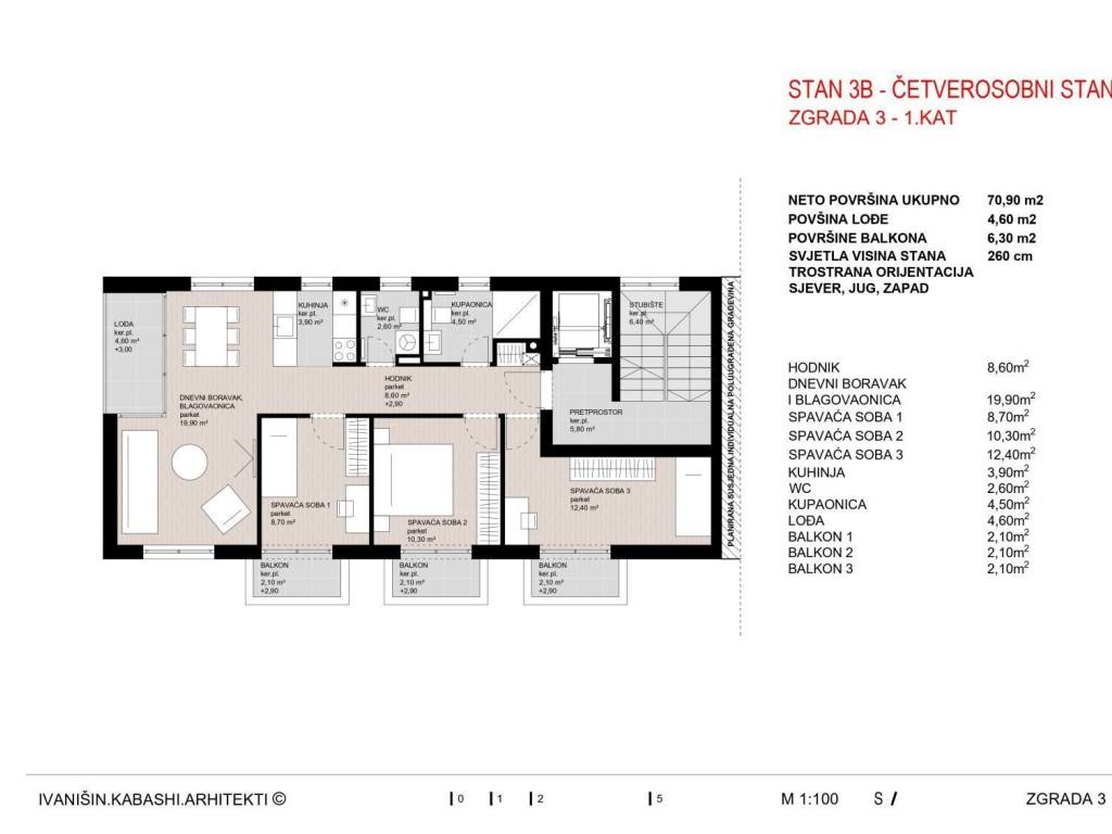 Sastoji se od: tri spavaće sobe, kuhinje , boravak, blagovaonica, kupaonica ,wc, lođe i tri balkona