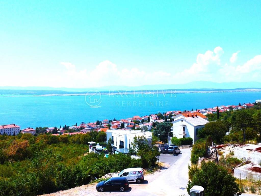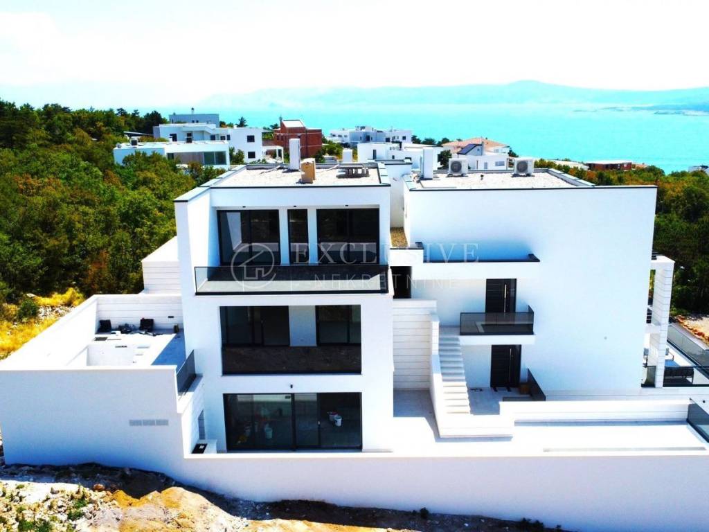 The apartment for sale here is two-storey and extends through the first and second floor. The first floor consists of an entrance hall with stairs to the upper floor, toilet with laundry, bedroom with private bathroom, kitchen with dining area and a spacious living room with access to a large covered terrace that connects to the north terrace on which a swimming pool and a barbecue area is located. The second floor consists of an entrance hall and two bedrooms - each with its own bathroom and access to a 23m2 large, shared, semi-covered terrace. Both terraces offer a beautiful view of the sea and the island of Krk.