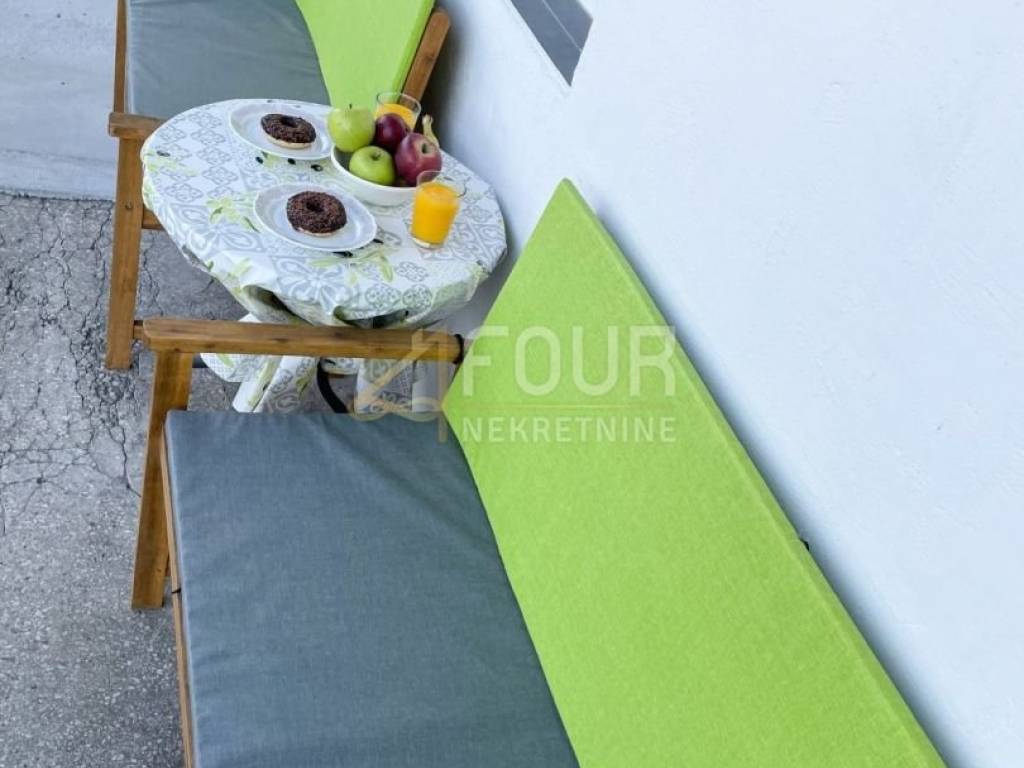 One unit consists of an entrance hall, bathroom, kitchen, and a combined living/sleeping area, while the other features a kitchen with a living room, bathroom, and a bedroom also facing south. In front of the apartments, there is a walk-through balcony with seating, and a dedicated storage room is located on the ground floor of the building. The apartments are bright and airy thanks to high ceilings and large south-facing windows, which provide plenty of natural light and warmth, even during the winter months.