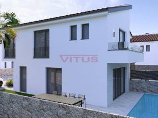 Island of Krk, Malinska! Semi-detached house of 100 m2 is located in a great location in Malinska. It consists of a ground floor and an upper floor. On the ground floor there is a kitchen with a dining room and a living room, a toilet and a terrace with access to the garden with a swimming pool and a sunbathing area. On the first floor there are three bedrooms, each with its own bathroom and a terrace. Quality construction and equipment, air conditioning in every room, underfloor heating controlled by WiFi, 2 parking spaces. The property is currently under construction, planned completion is 12/2025. Quiet location 900 m from the sea!