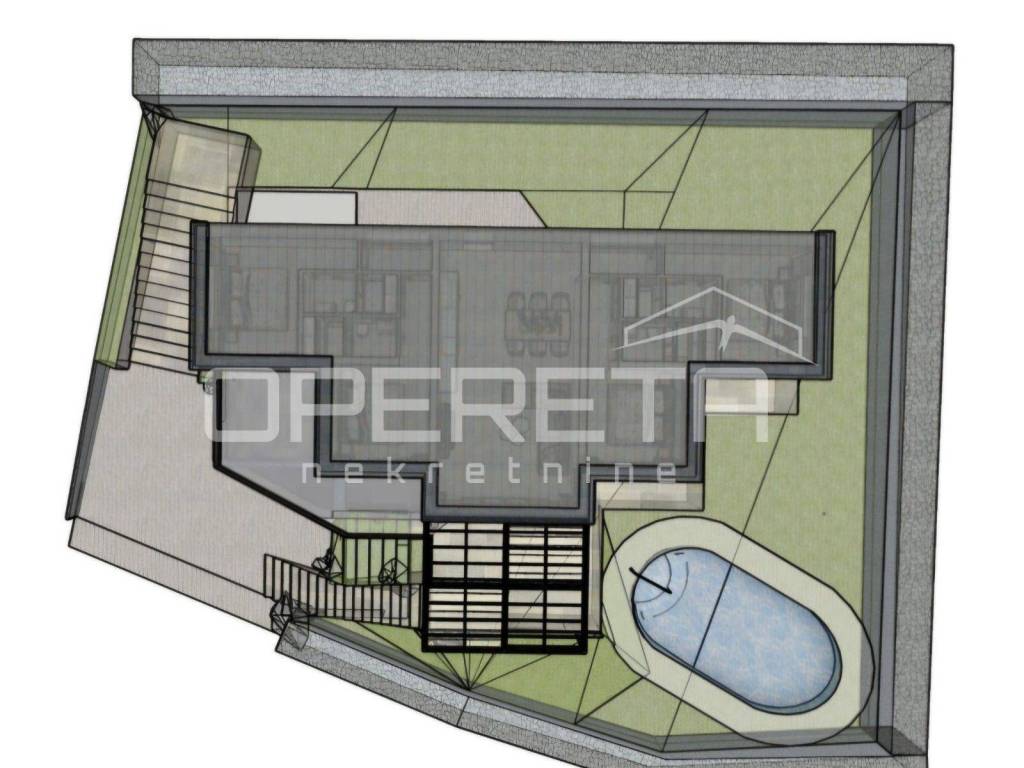 The roof is flat, with the possibility of creating a spacious rooftop terrace with sea views. The garden is landscaped in Mediterranean style, featuring dry stone walls, olive trees, and aromatic herbs, with an oval stone-paved pool at its center.