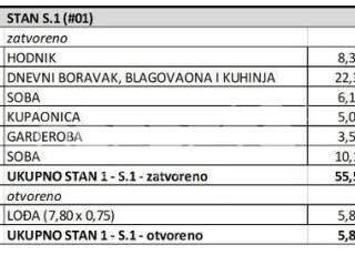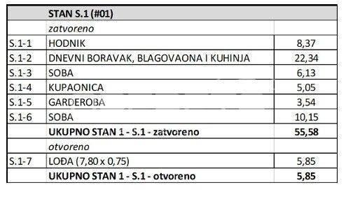 Stan oznake S1 nalazi se u prizemlju stambene zgrade u izgradnji od ukupno 2 kata. Sastoji se od velikog "open space" dnevnog boravka s kuhinjom i blagovaonicom te izlazom na lođu, 2 sobe, kupaonice s wc-om, zasebne garderobe i hodnika.