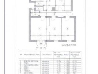 Stan je ukupne stambene površine 120,57 m2 te se sastoji 5 zasebnih velikih soba i 2 pomoćne prostorije, velikog hodnika, toaleta i kupaonice. Stan ima dva balkona. Orijentacija je istok, jug i sjever. Visoki plafoni i veliki prozori čine ga komfornim i sunčanim.
