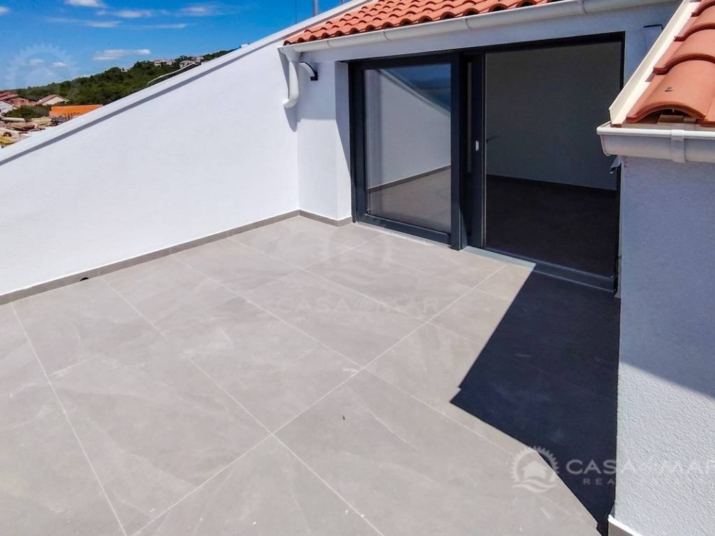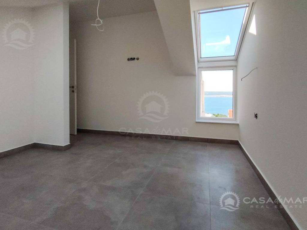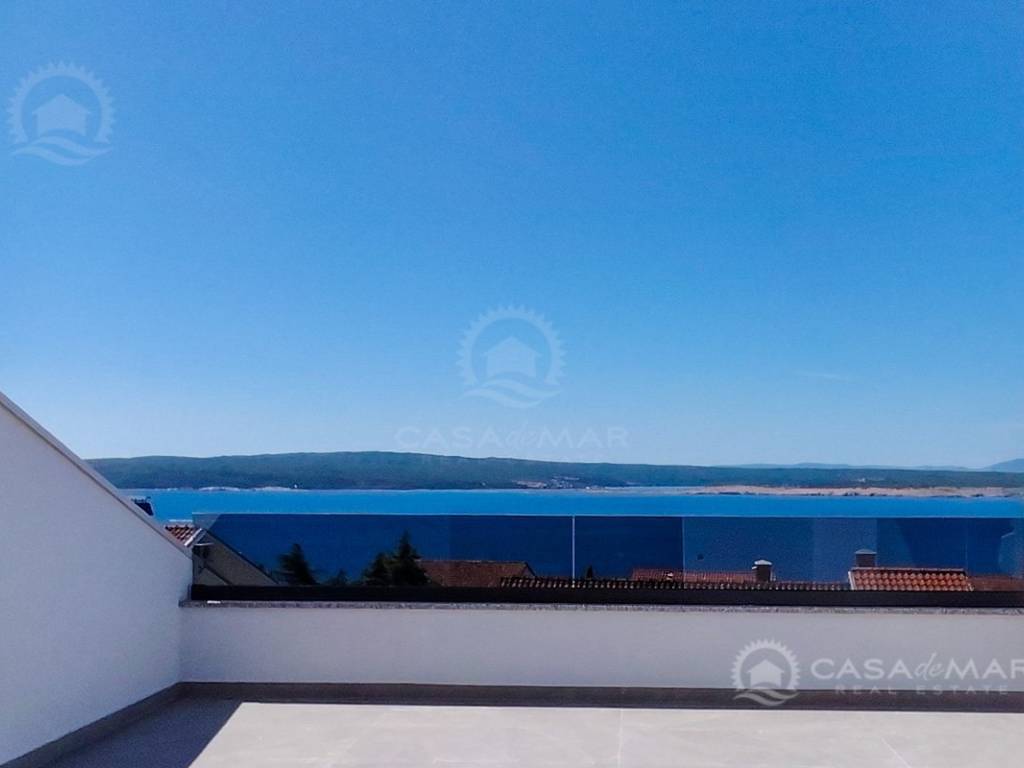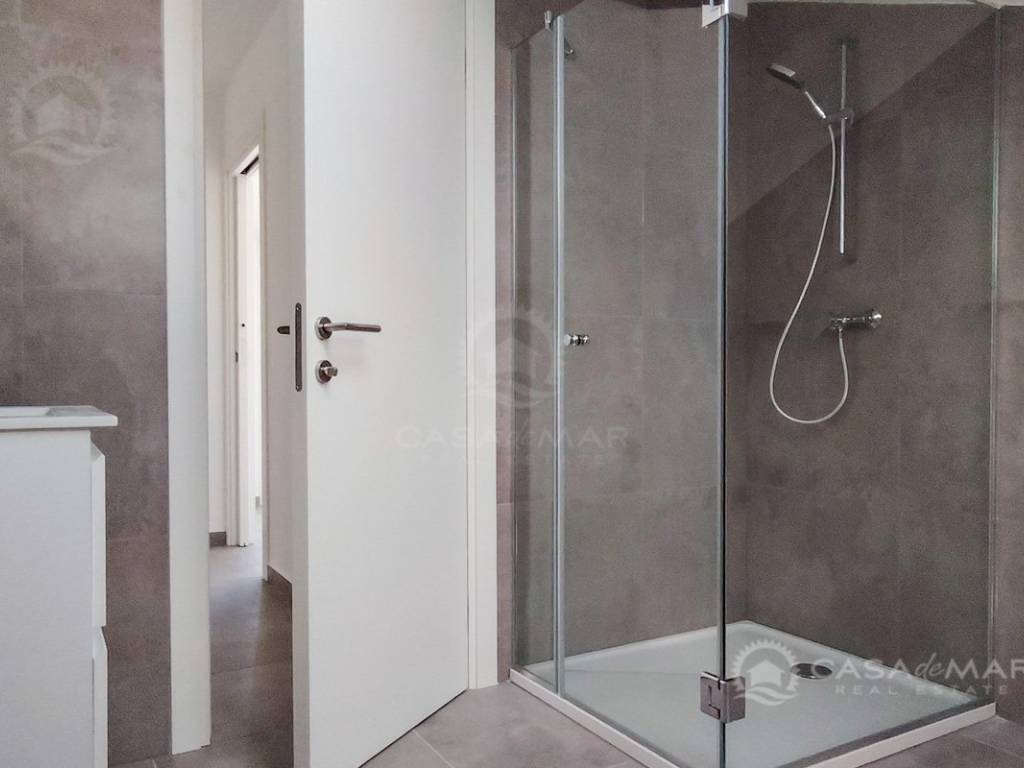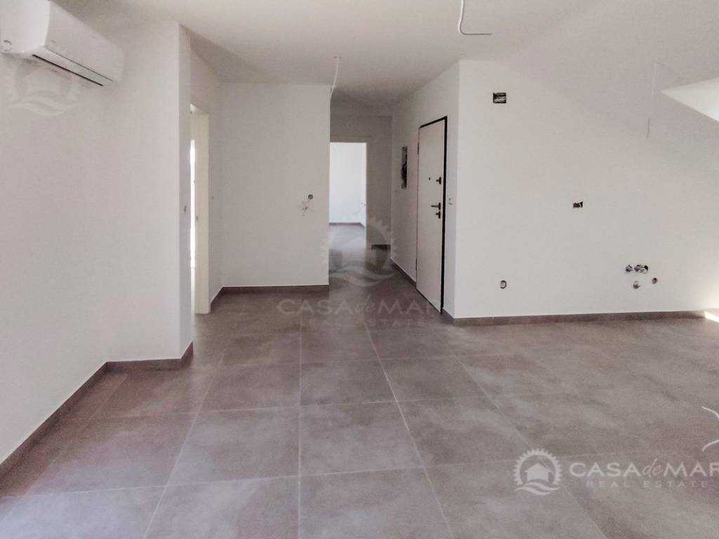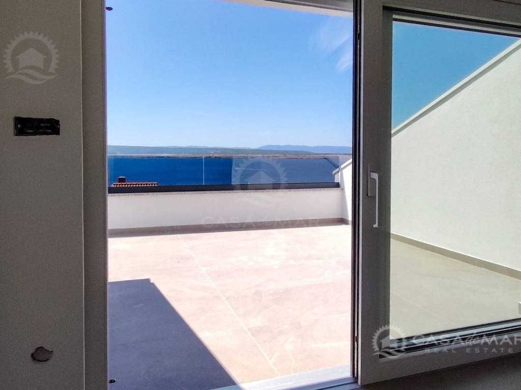 It consists of a spacious and bright open-space living room with a kitchen, three large bedrooms, two bathrooms, and two terraces with panoramic sea views.