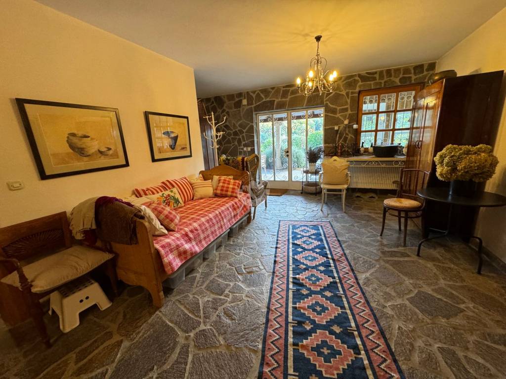 Первый этаж этой внушительной виллы украшает просторная гостиная, наполненная естественным светом, с выходом на террасу. Высокие потолки с деревянными балками подчёркивают аутентичность и шарм дома, а камин, являющийся центральным элементом помещения, обеспечивает дополнительное тепло и уют.