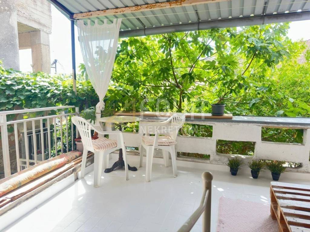Two terraces stand out: one is covered with grapevines, providing natural shade during summer, and the other is designed as an open-air living room with a beautiful view of greenery and the rooftops of Pula.